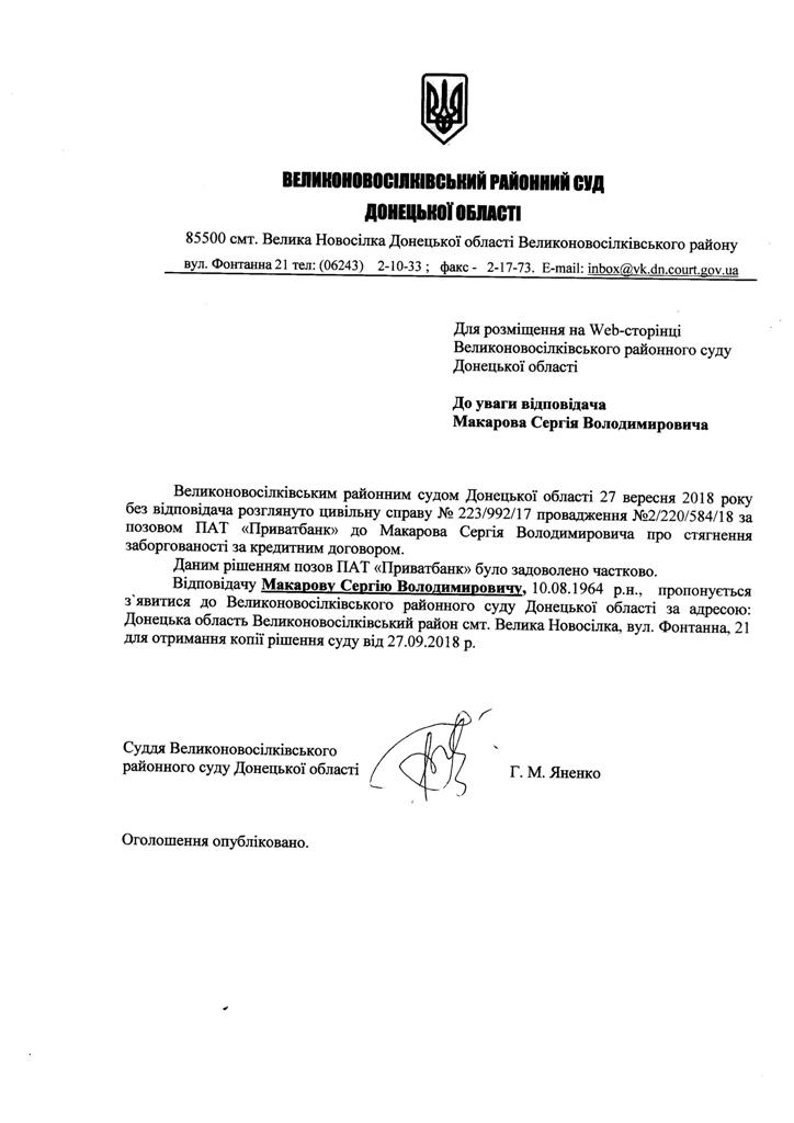 Оголошення для Макарова С.В. щодо отримання копії рішення