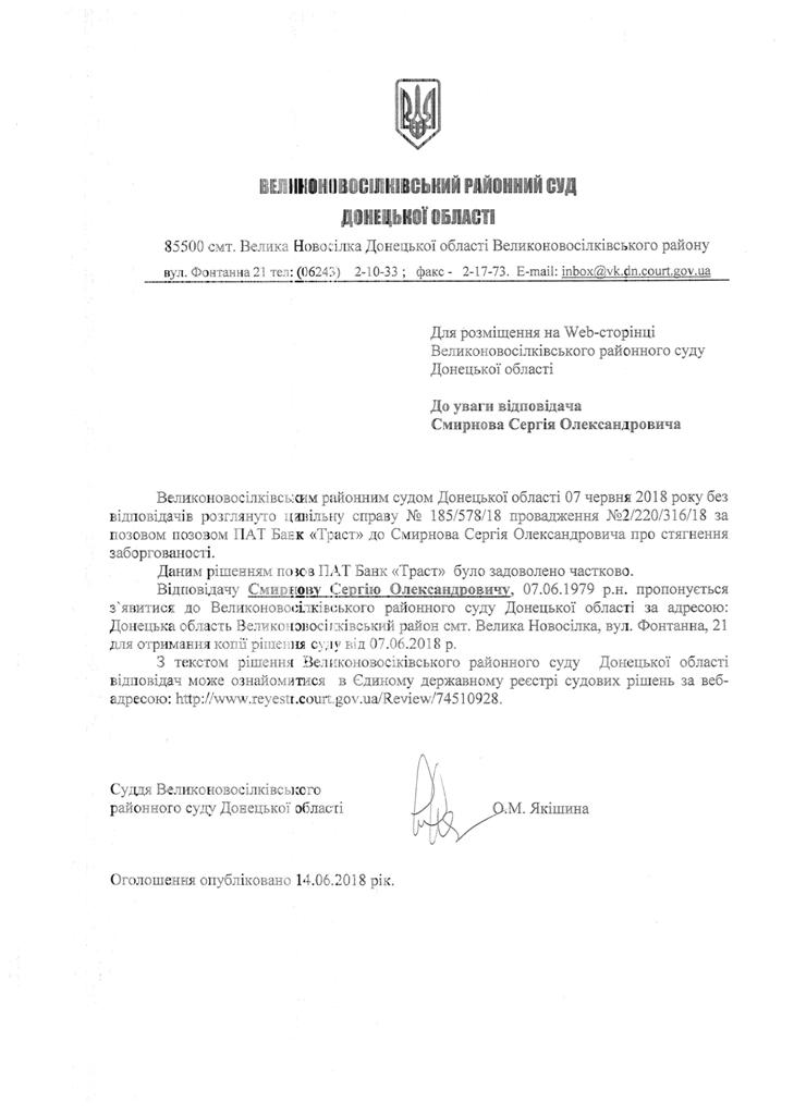 Оголошення про виклик до суду Смирнова С.О.