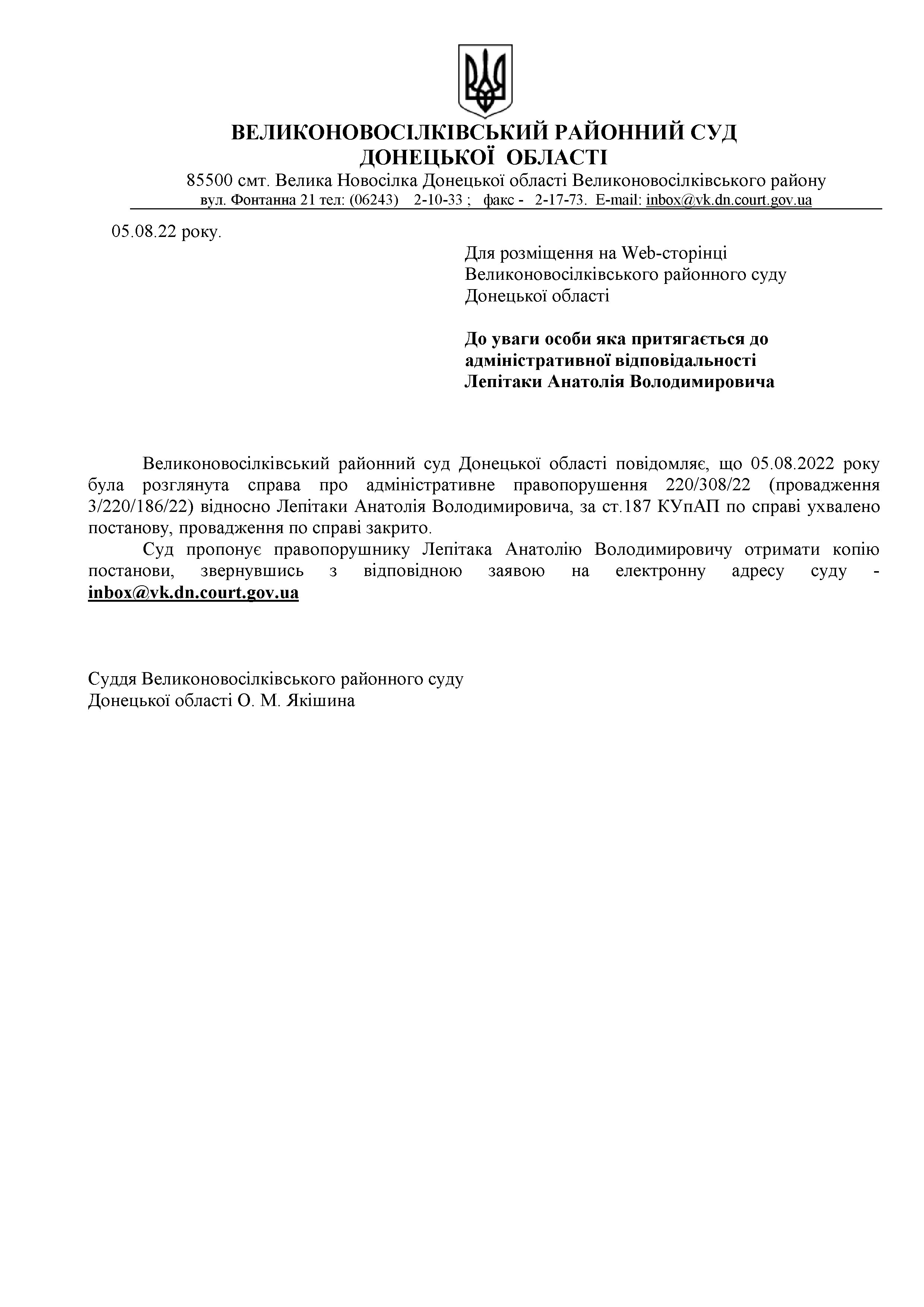 До уваги особи, яка притягається до адміністративної відповідальності Лепітаки Анатолія Володимировича!