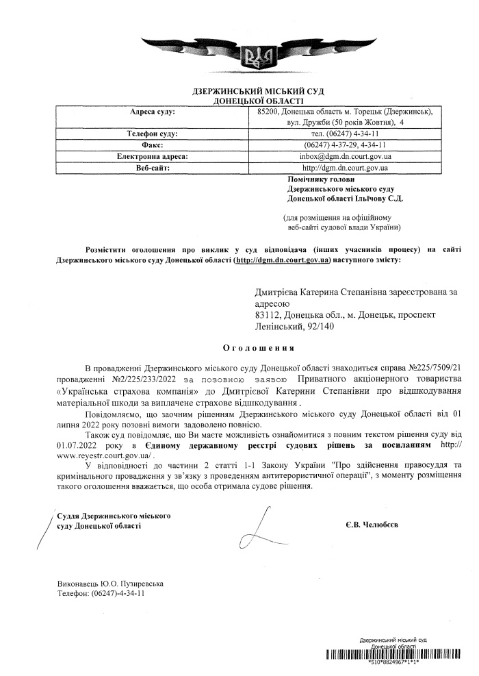 Повідомлення про винесення рішення по справі №225/7509/21