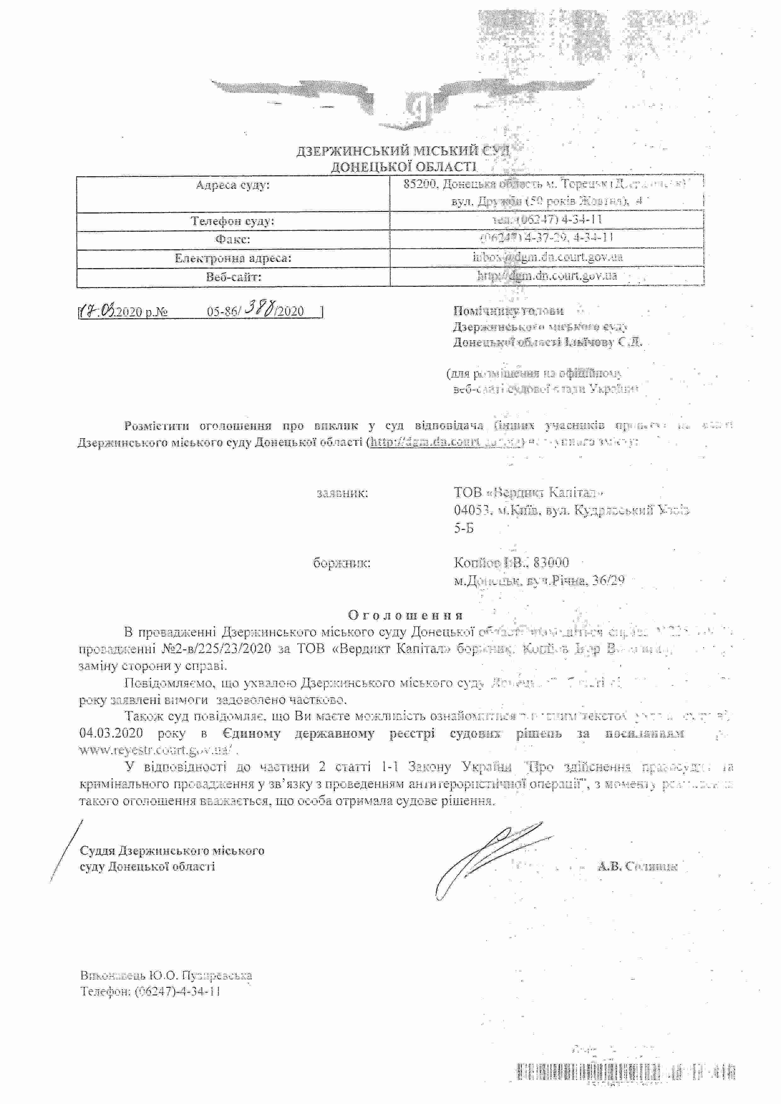 Повідомлення про винесення ухвали по справі 225/549/20 за заявою ТОВ "Вердикт Капітал"