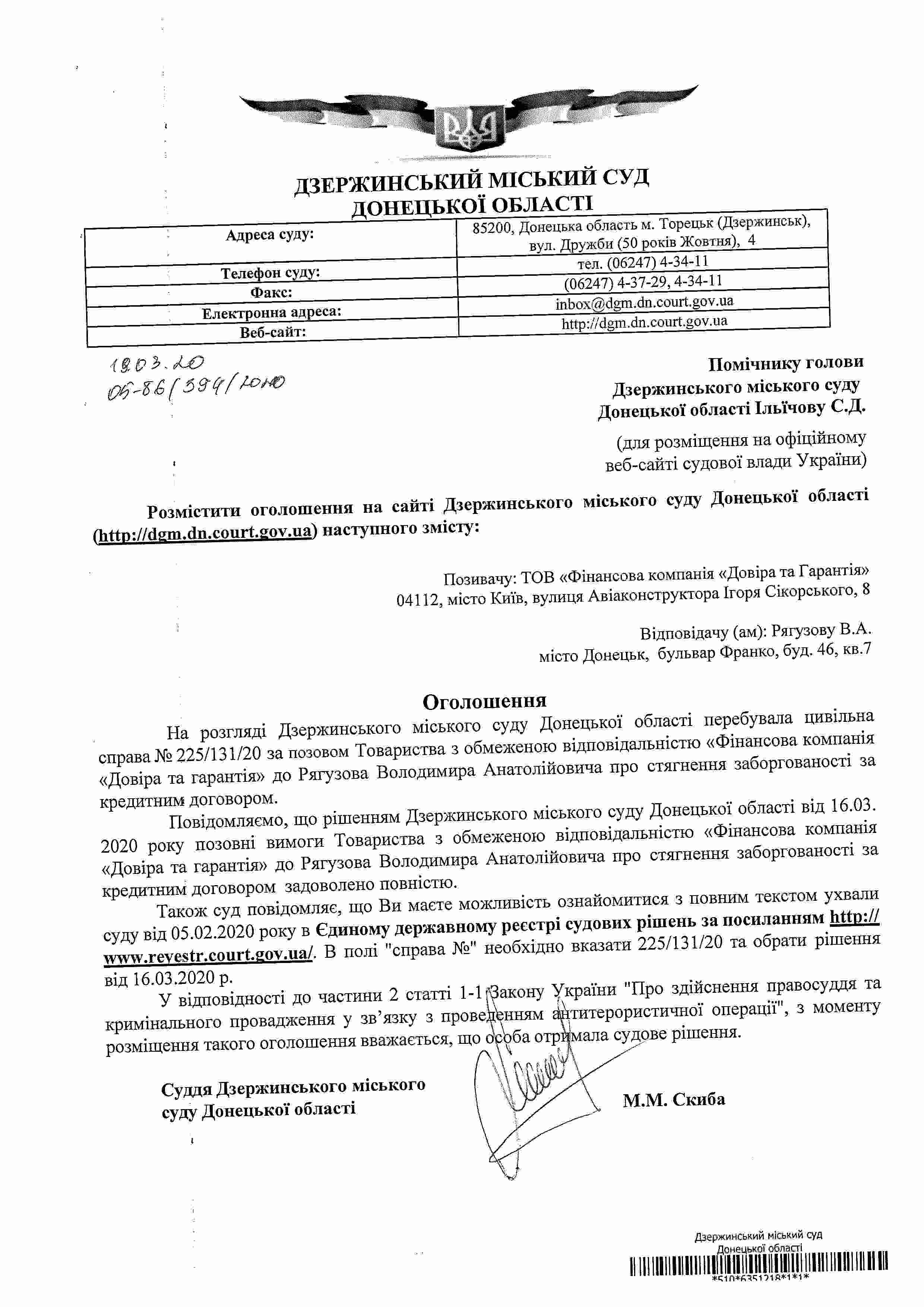 Повідомлення про винесення рішення по справі за позовом ТОВ "ФК "Довіра та Гарантія" до Рягузова В.А., яким позовні вимоги задоволено повністю