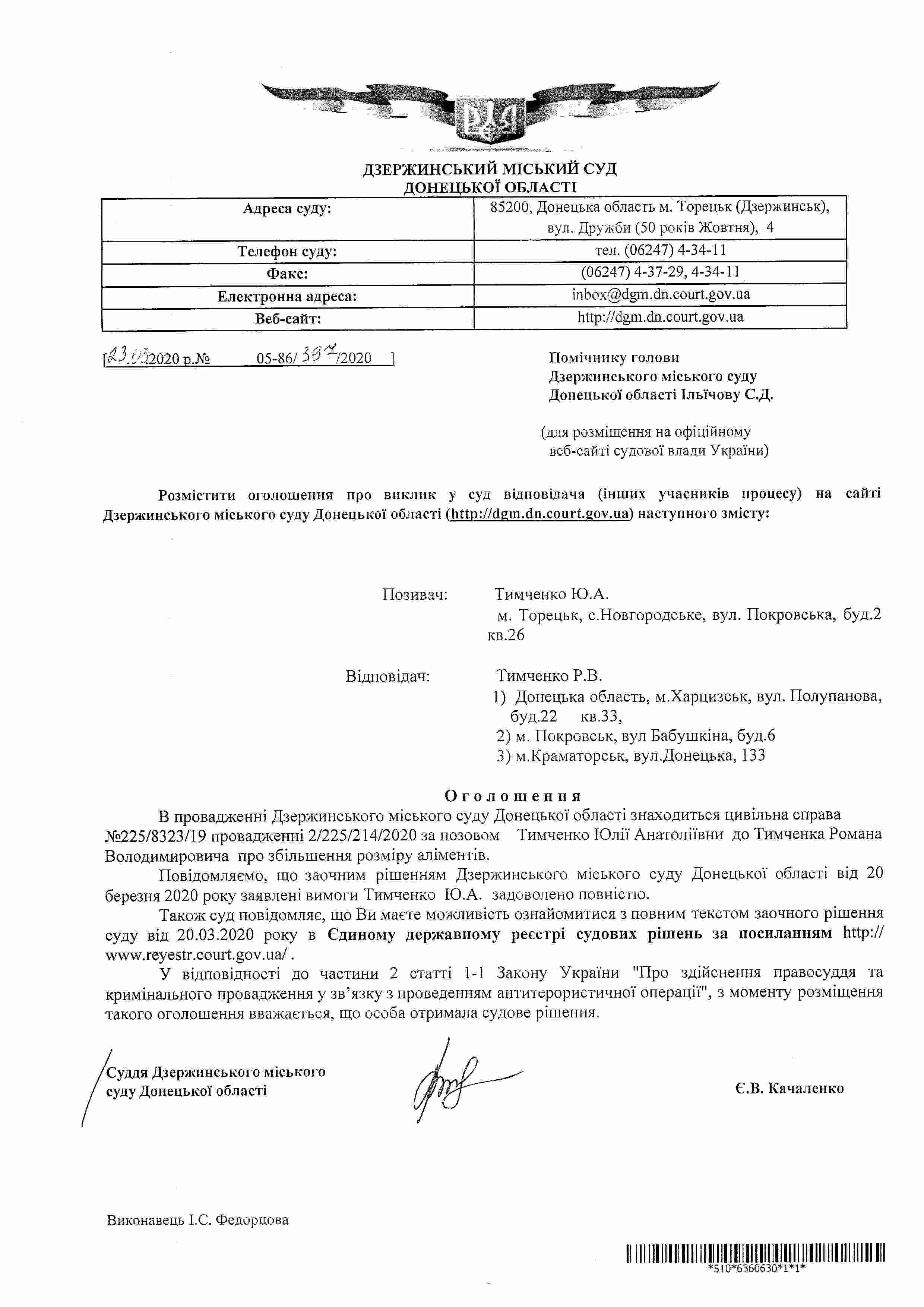 Повідомлення про винесення рішення по справі за позовом Тимченко Ю.А. до Тимченка Р.В., яким заявлені вимоги задоволено повністю