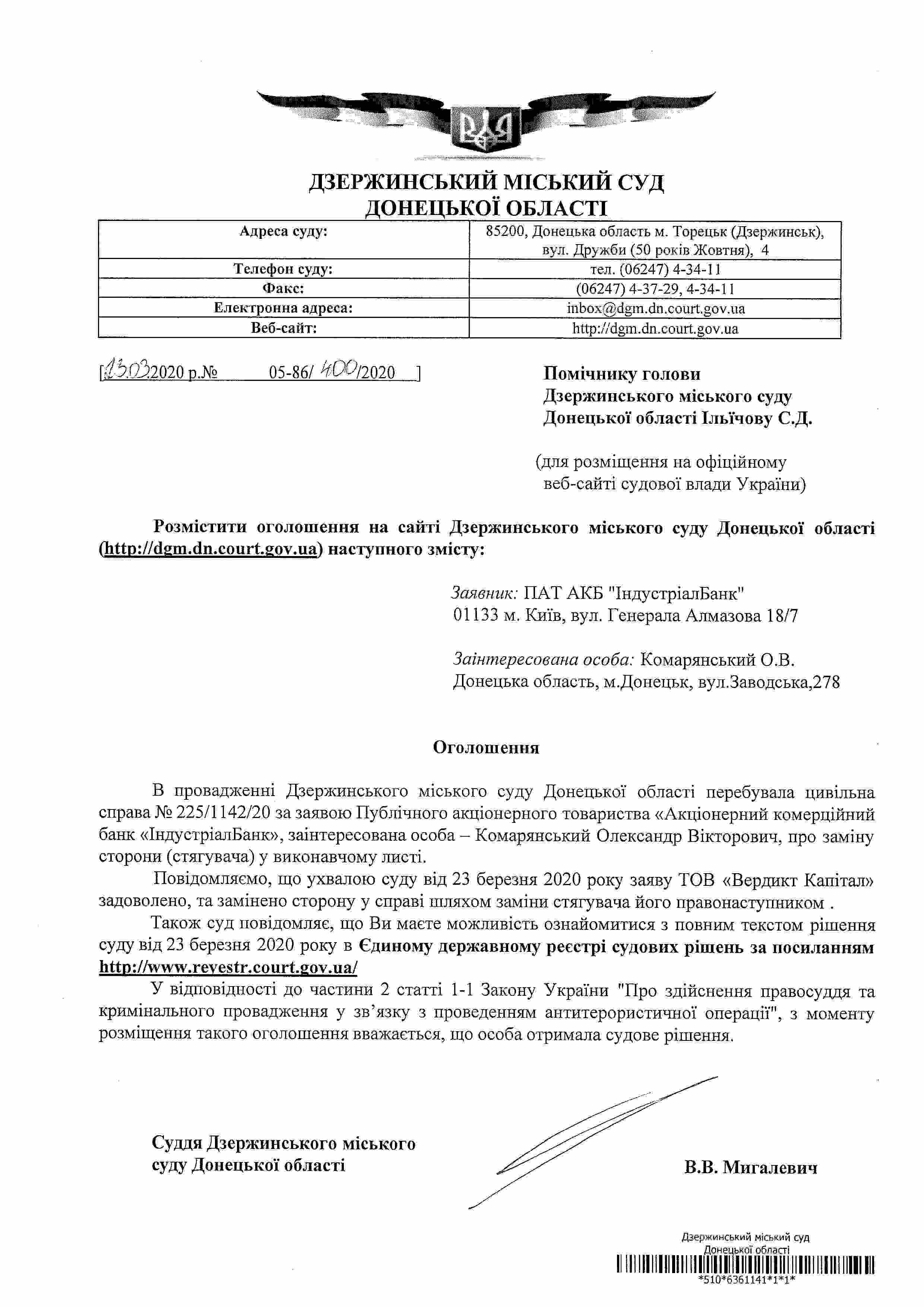 Повідомлення про винесення ухвали по справі 225/1142/20 за заявою ПАТ "АКБ "ІндустріалБанк", якою замінено сторону у справі шляхом заміни стягувача правонаступником