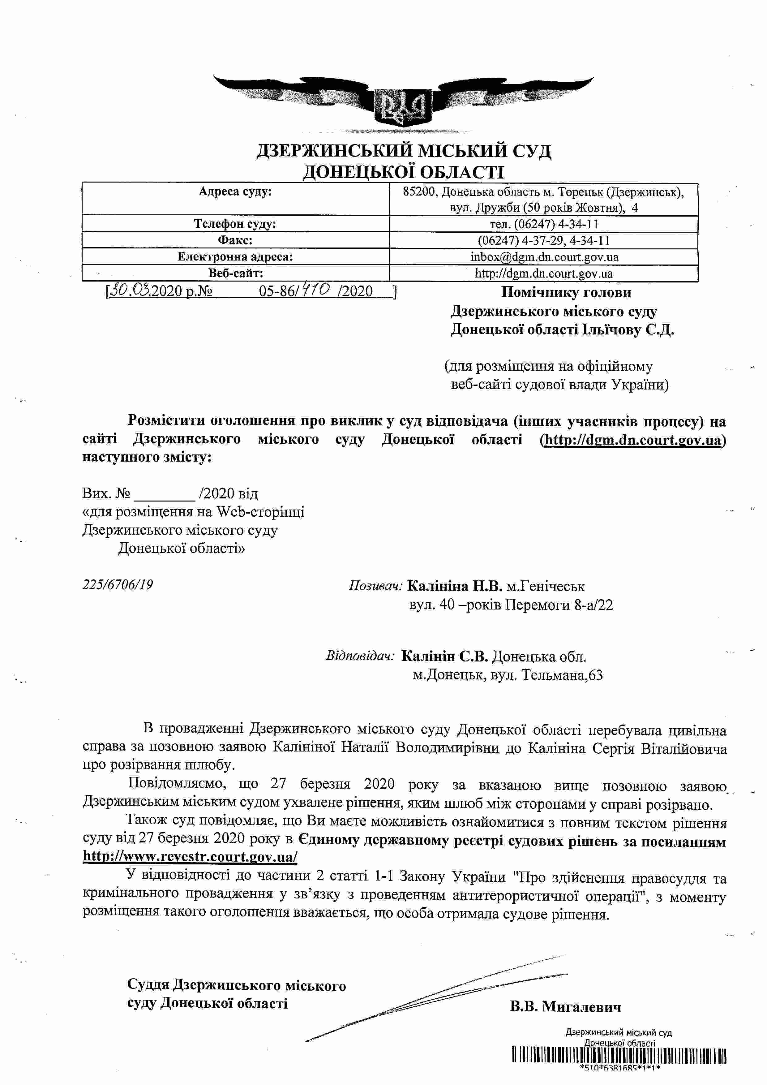 Повідомлення про винесення рішення по справі за позовом Калініної Н.В. до Калініна С.В., яким шлюб між сторонами розірвано