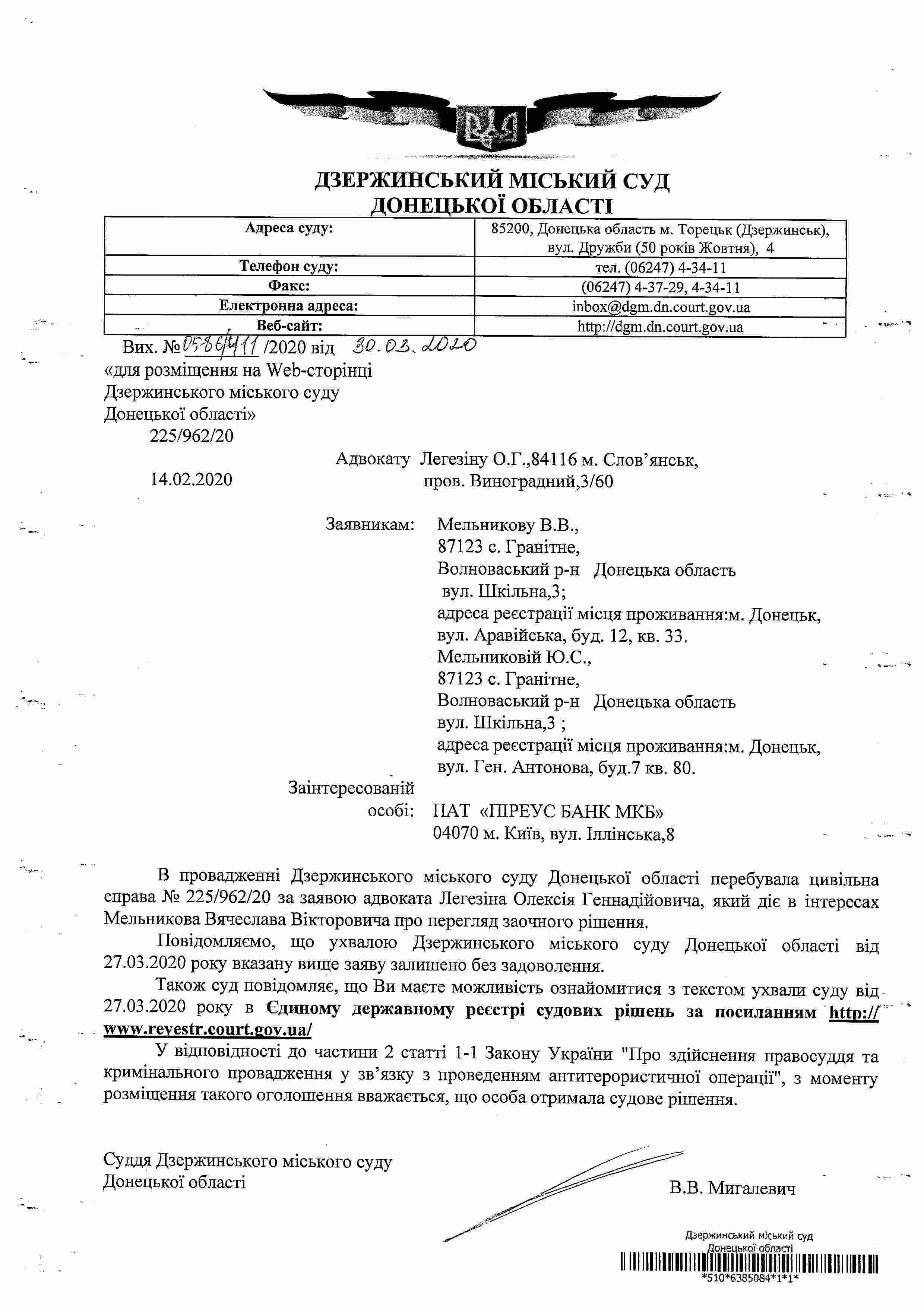 Повідомлення про винесення ухвали по справі за заявою Легезіна О.Г. в ін. Мельникова В.В., якою заяву залишено без задоволення