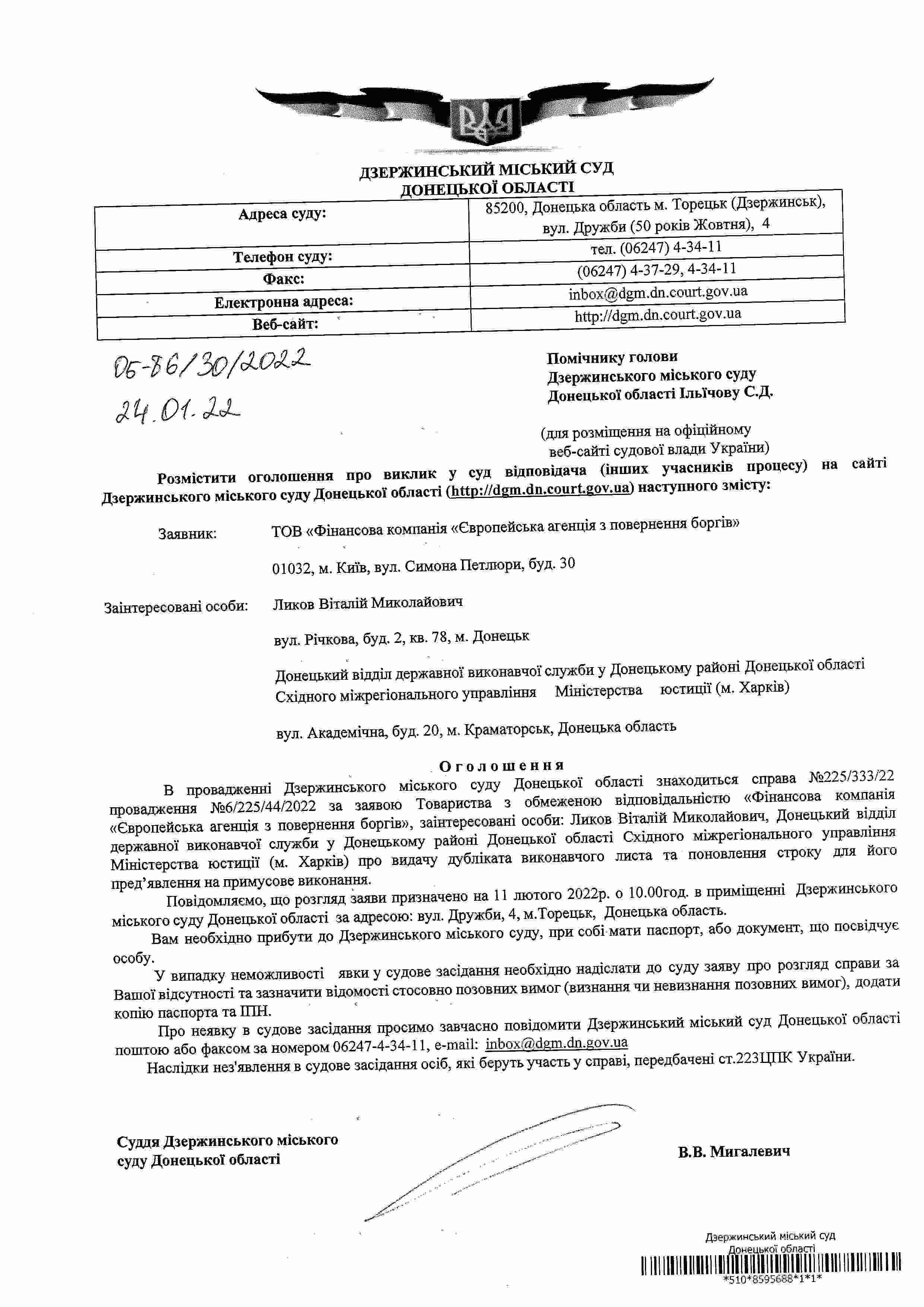 Виклик до суду по справі №225/333/22 за заявою ТОВ ФК "ЄАПБ"
