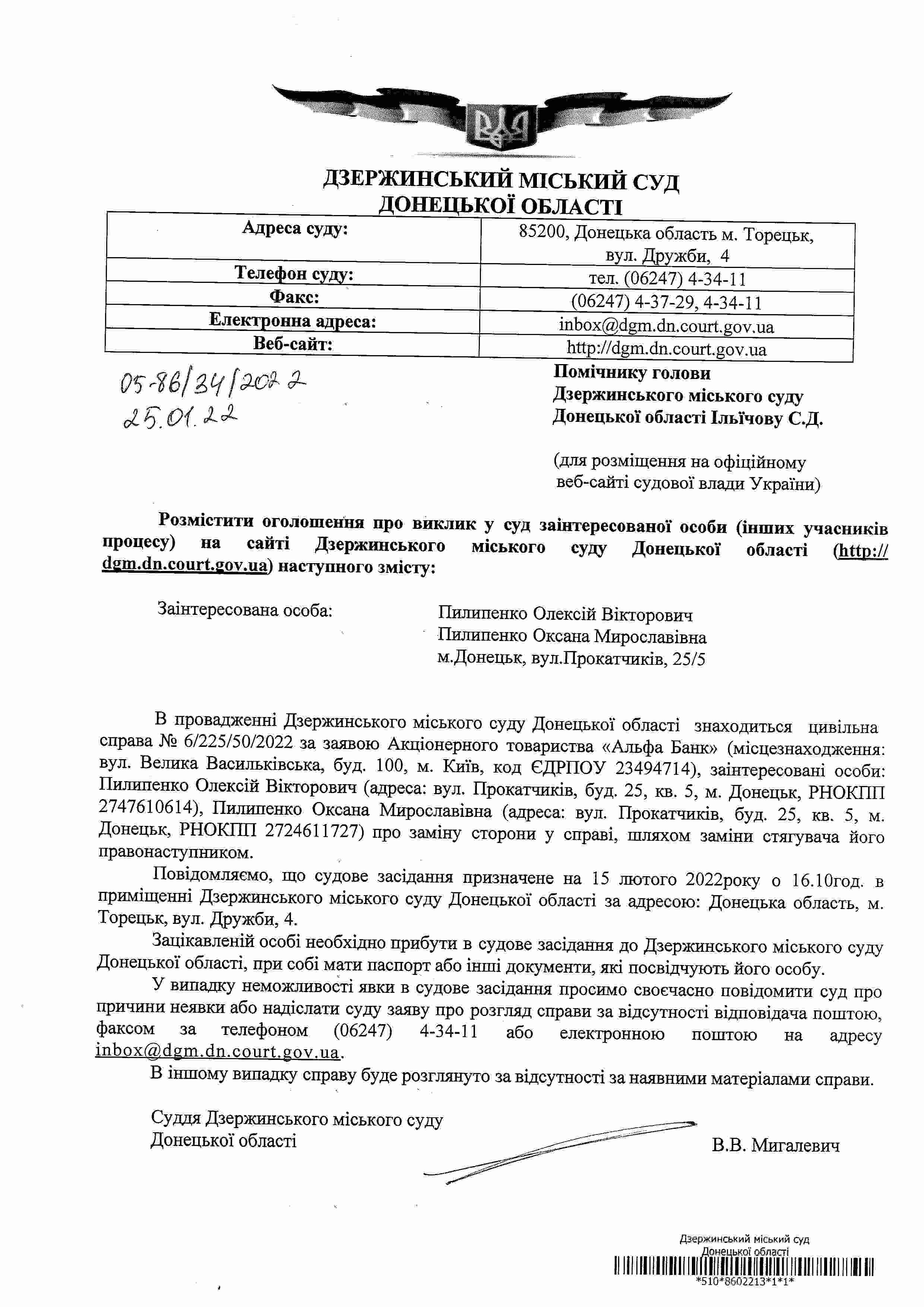Виклик до суду по справі №6/225/50/2022 за заявою АТ "Альфа Банк"