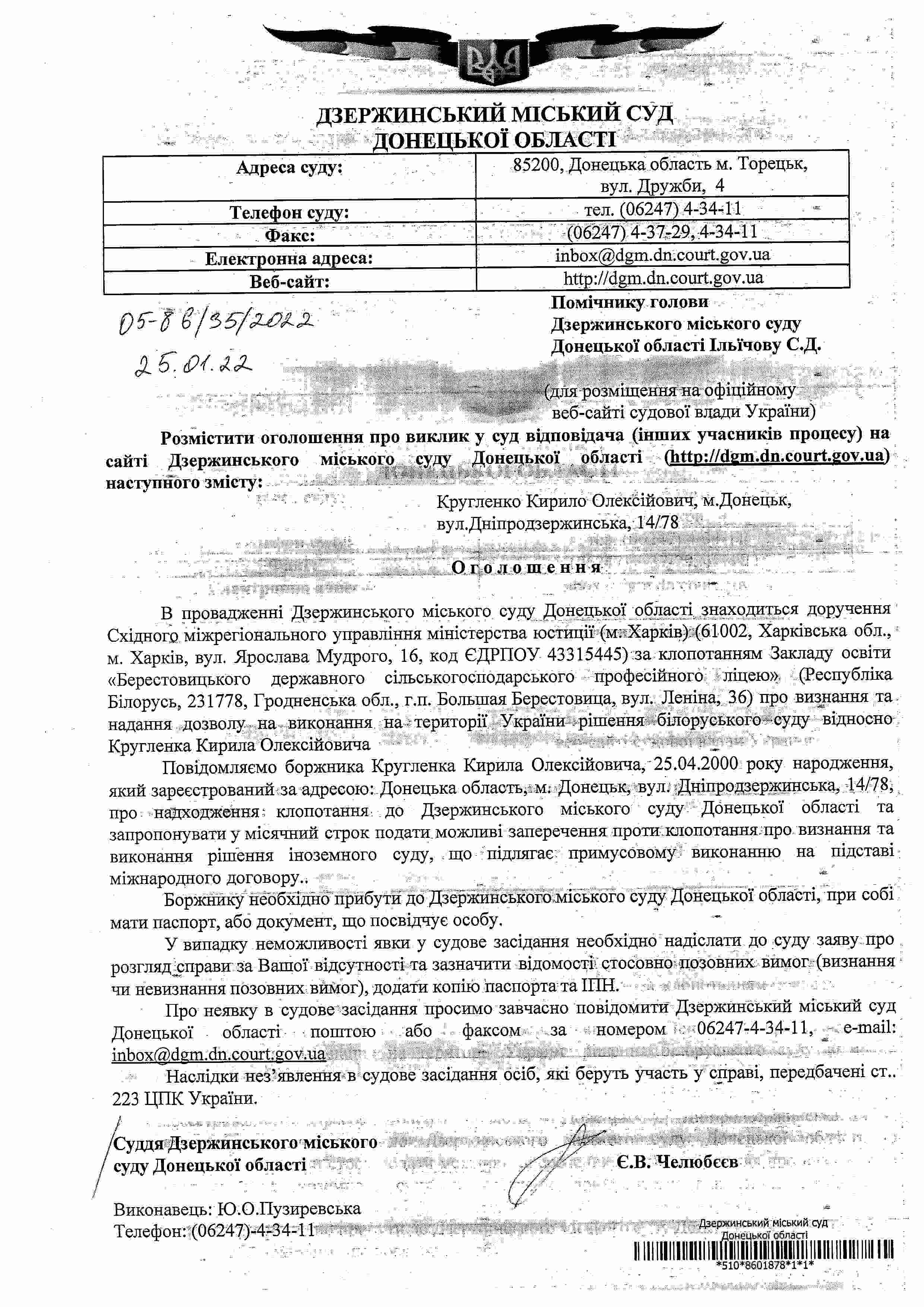 Виклик до суду по справі за клопотанням Закладу освіти "Берестовицького державного сільськогосподарського професійного ліцею" (Республіка Білорусь)