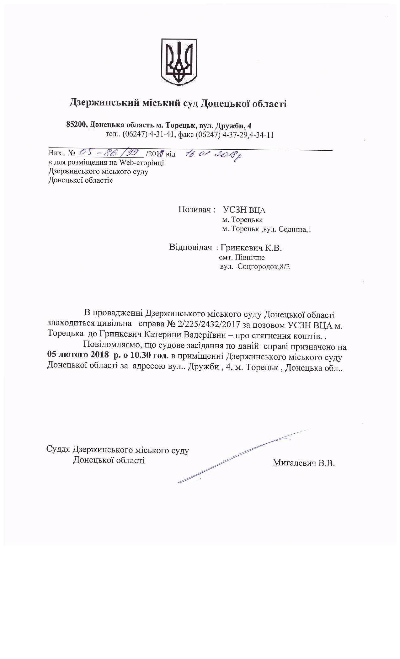 Повідомлення про слухання цивільної справи за позовом УСЗН ВЦА м.Торецька до Гринкевич К.В. про стягнення коштів.