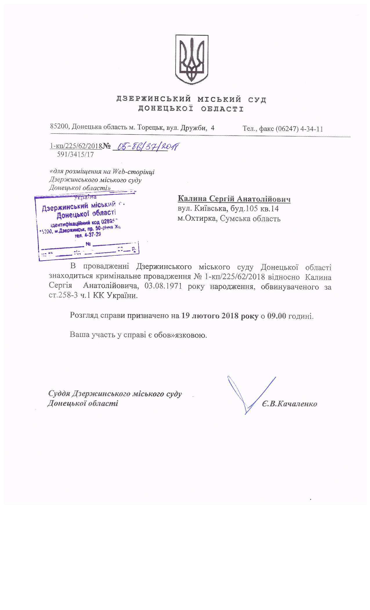 Повідомлення в кримінальній справі відносно Калини С.А. за ч.1 ст.258-3 КК України.