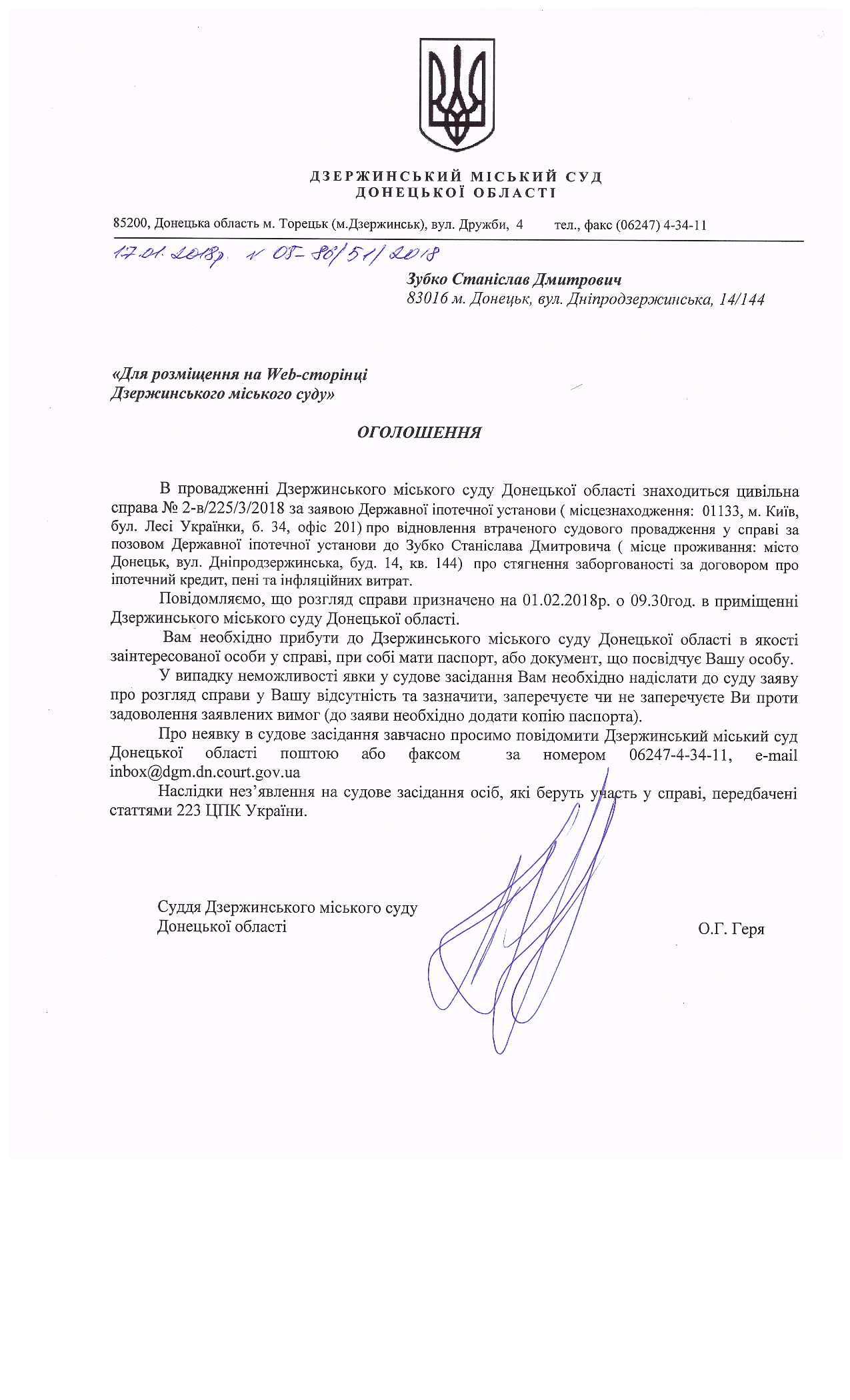 Оголошення про виклик відповідача Зубко С.Д.