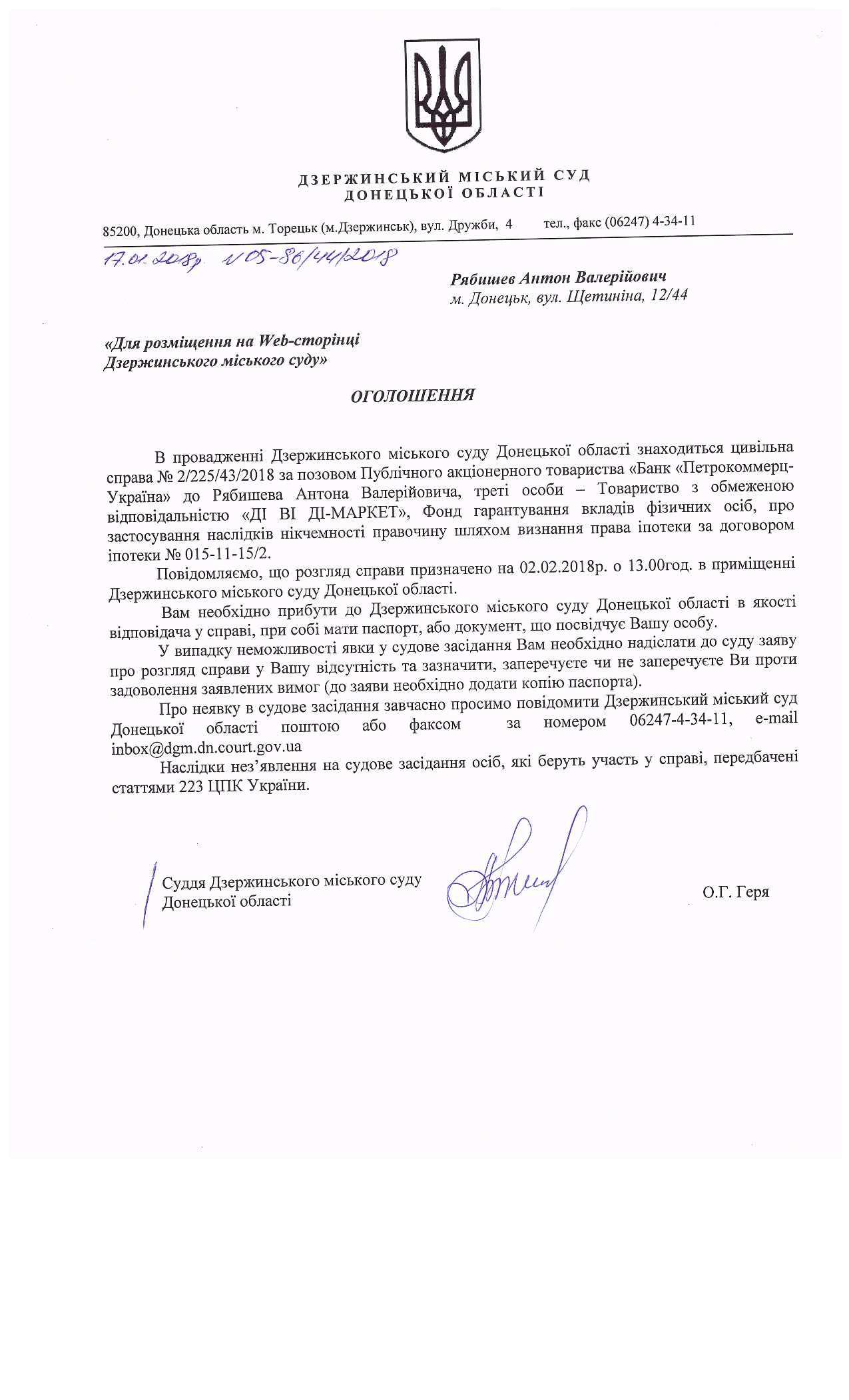 Оголошення про виклик відповідача Рябишева А.В. у цивільній справі №2/225/43/2018.