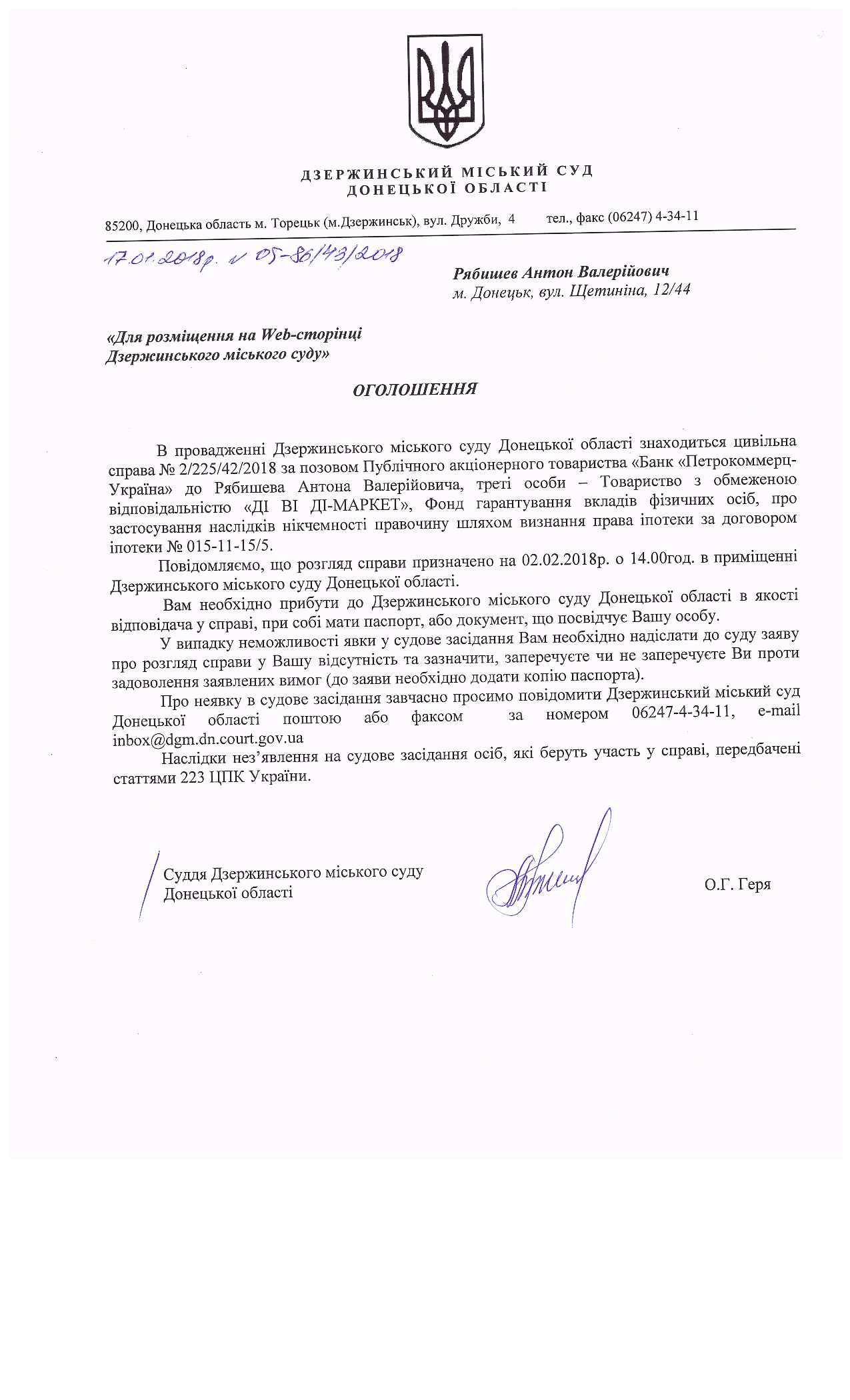 Оголошення про виклик відповідача Рябишева А.В. у цивільній справі №2/225/42/2018.