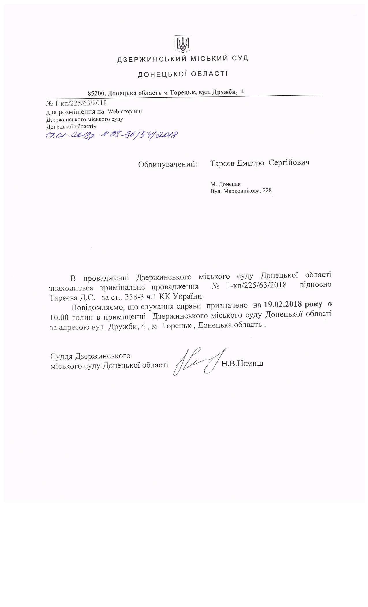 Повідомлення в кримінальній справі відносно Тарєєва Д.С. за ч.1 ст.258-3 КК України.