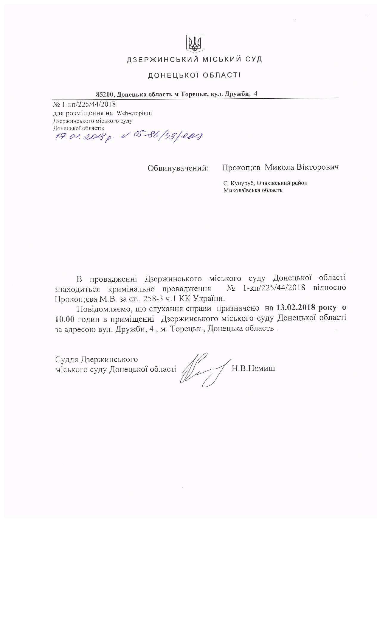 Повідомлення в кримінальній справі відносно Прокоп'єва М.В. за ч.1 ст.258-3 КК України.