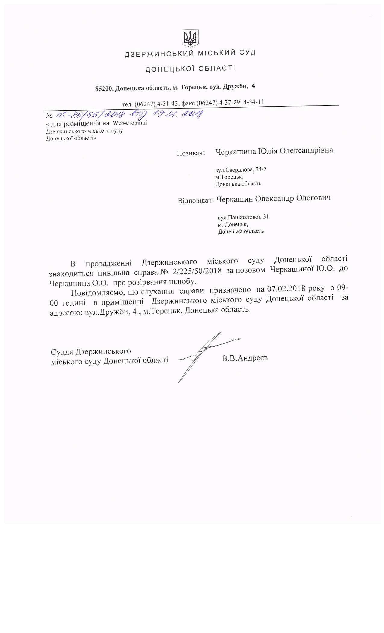 Повідомлення про слухання цивільної справи за позовом Черкашиної Ю.О. до Черкашина О.О. про розірвання шлюбу.