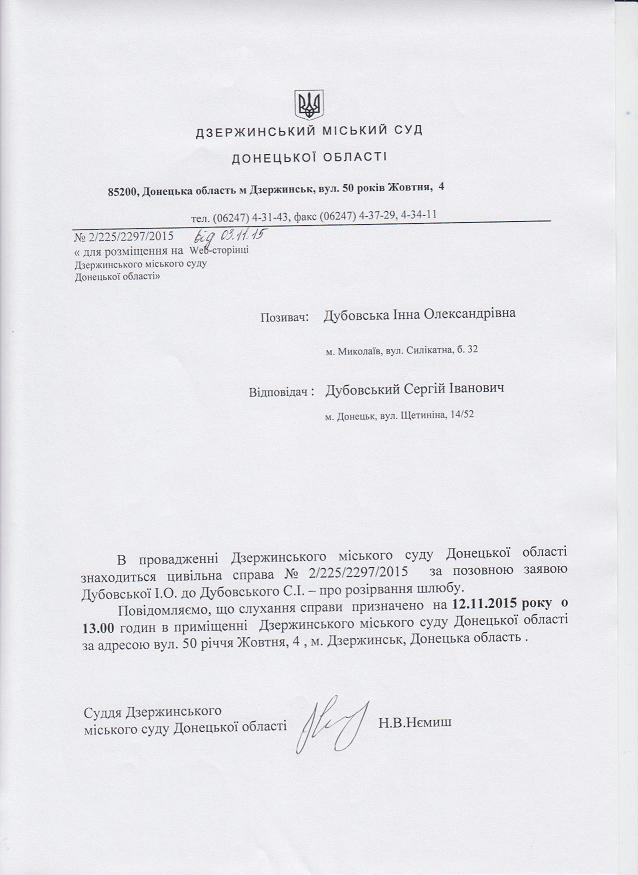 Виклик до суду по справі Дубовської Інни Олександрівни до Дубовського Сергія Івановича