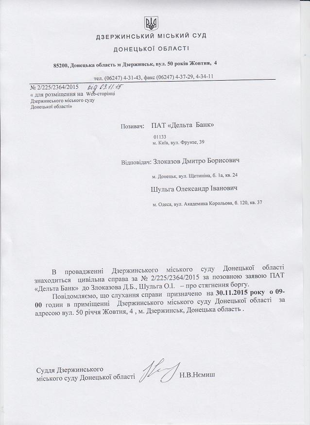 виклик до суду по справі ПАТ "Дельта Банк" до Злоказова Дмитра Борисовича, Шульга Олександра Івановича