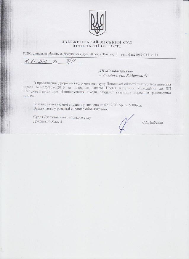 Виклик до суду ДП "Селідоввугілля" за позовом Несвіт Катерини Миколаївни