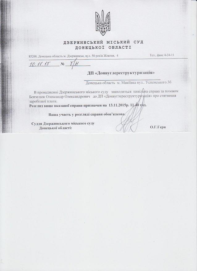 Виклик до суду ДП "Донвуглереструктирізація" за позовом Бензелюк О.О.