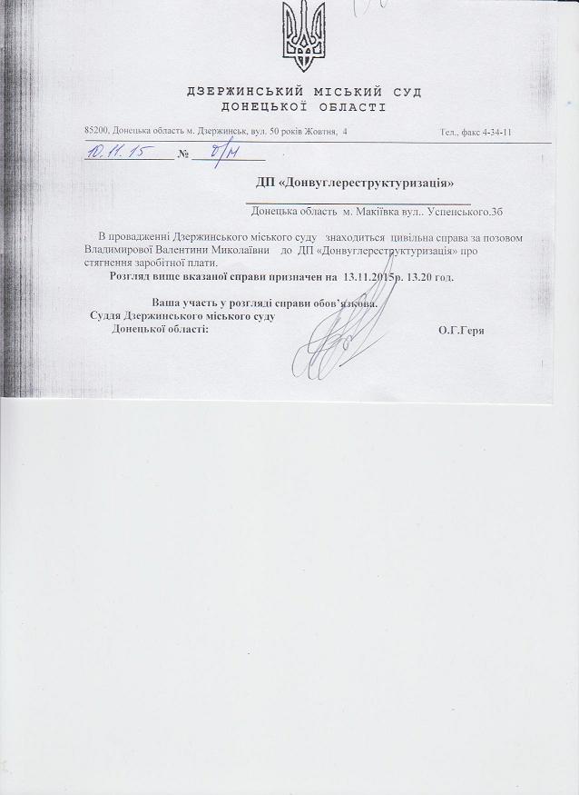 Виклик до суду ДП "Донвуглереструктирізація" за позовом Владимирової В.М.