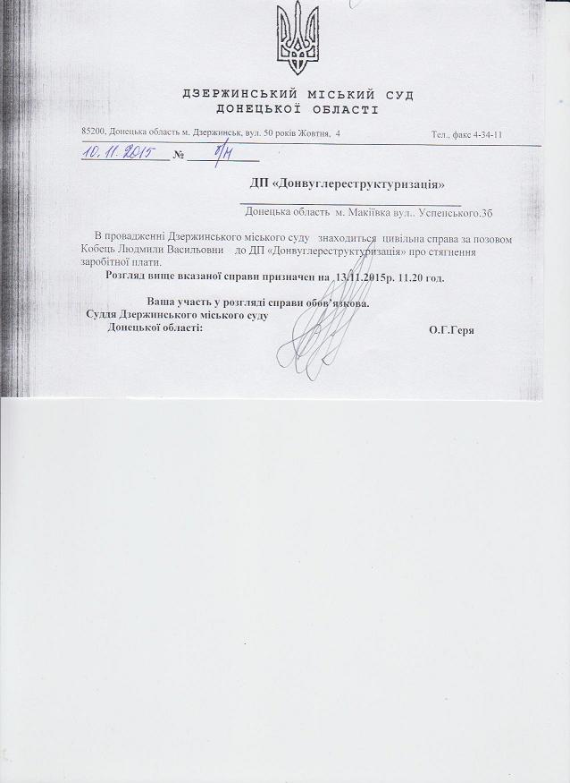 Виклик до суду ДП "Донвуглереструктирізація" за позовом Кобель Л.В.