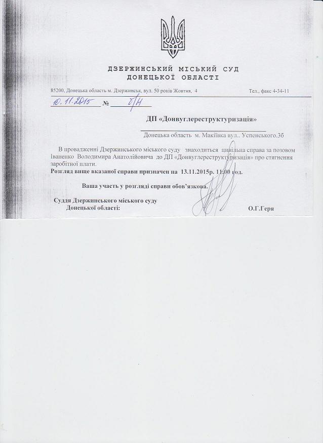 Виклик до суду ДП "Донвуглереструктирізація" за позовом Іваненко В.А.