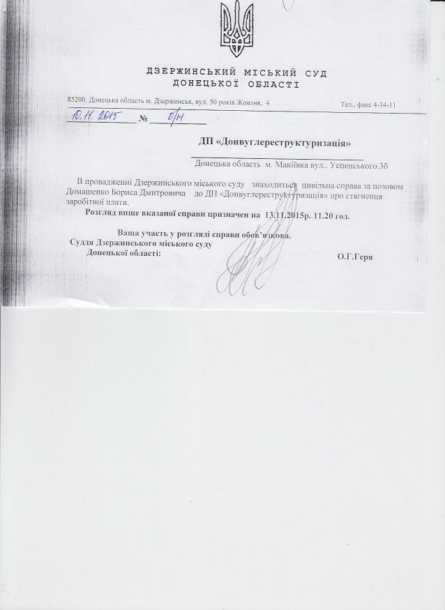 Виклик до суду ДП "Донвуглереструктирізація" за позовом Домашенко Б.Д.