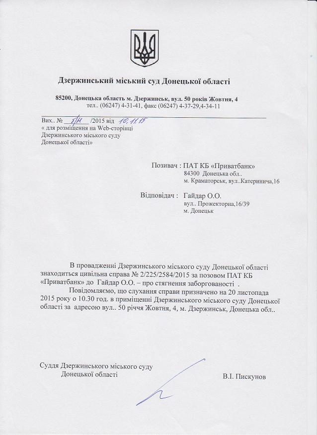 Виклик до суду по справі ПАТ КБ "Приват Банк" до Гайдар О.О.