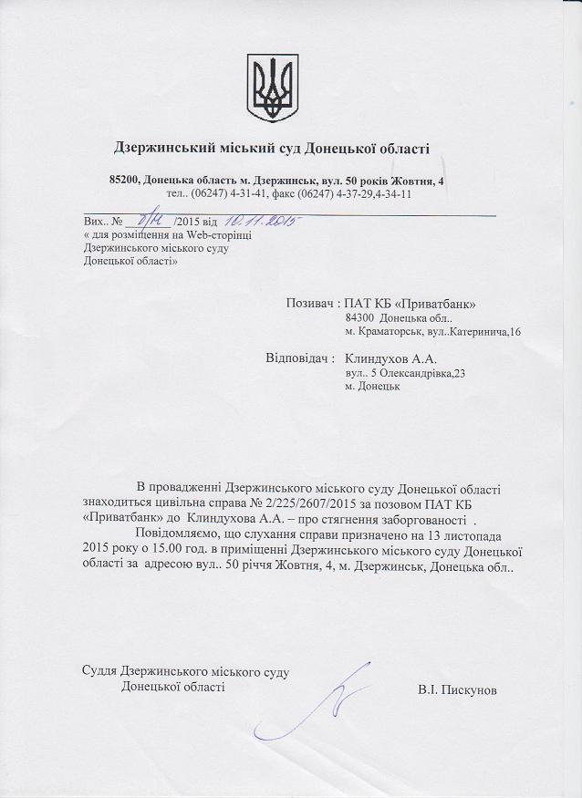 виклик до суду по справі ПАТ КБ "Приват Банк" до Клиндухова А.А.