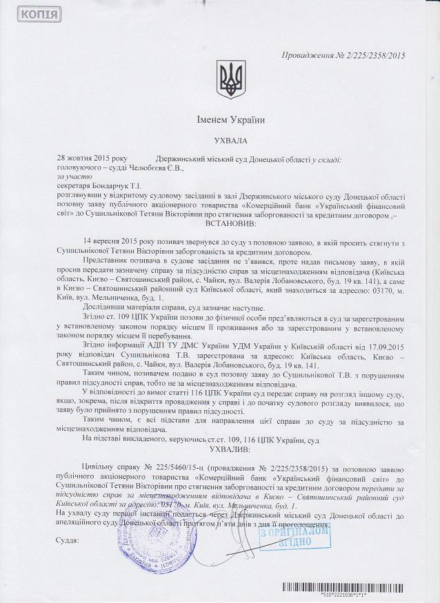 повідомлення про передачу справи за підсудністю за позовом ПАТ"Комерційний банк"Український фінансовий світ" до Сушильнікової Т.В.