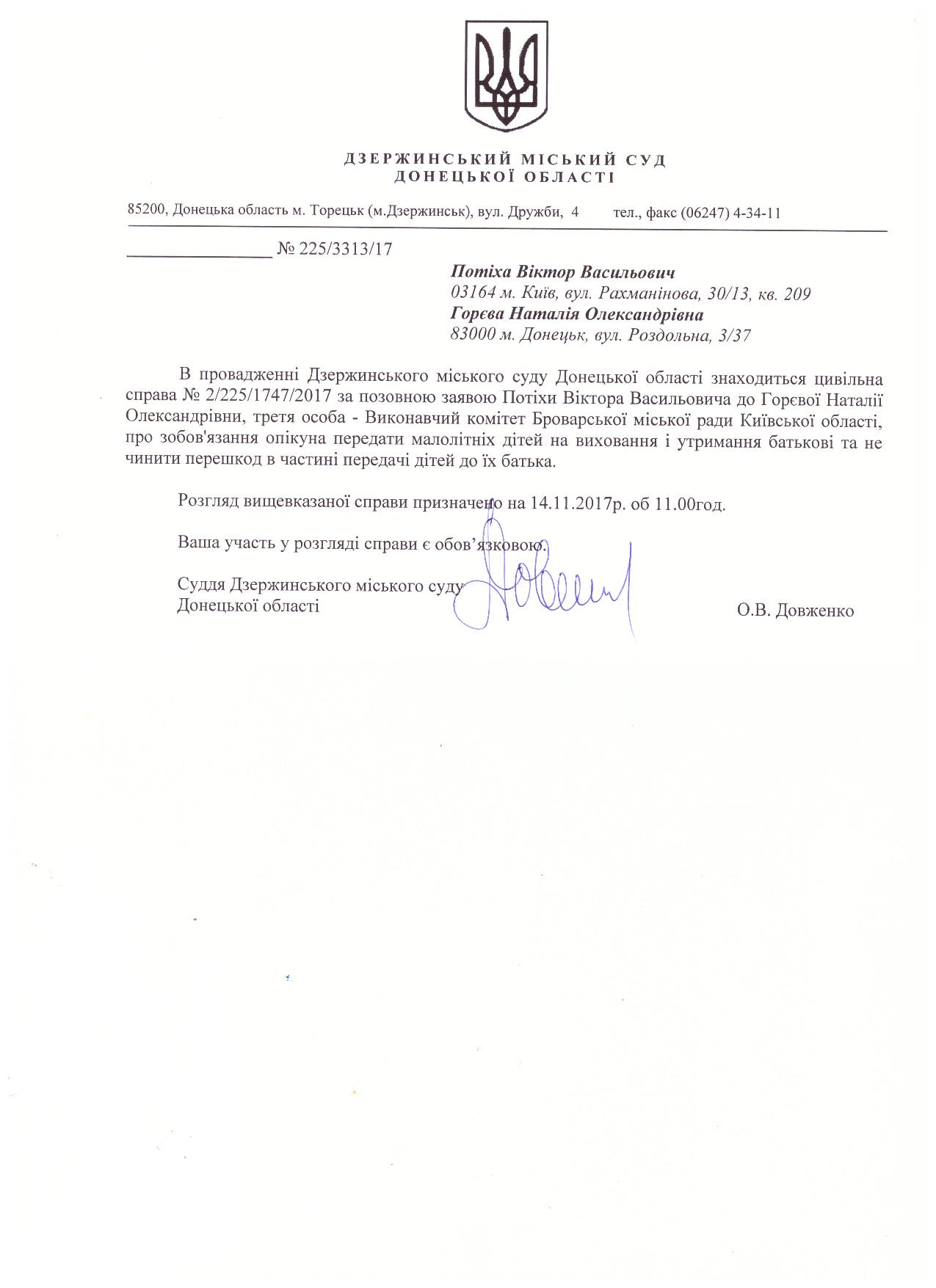Виклик сторін до суду по справі за позовом Потіхи В.В. до Горєвої Н.О., третя особа - Виконавчий комітет Броварської міської ради Київської області
