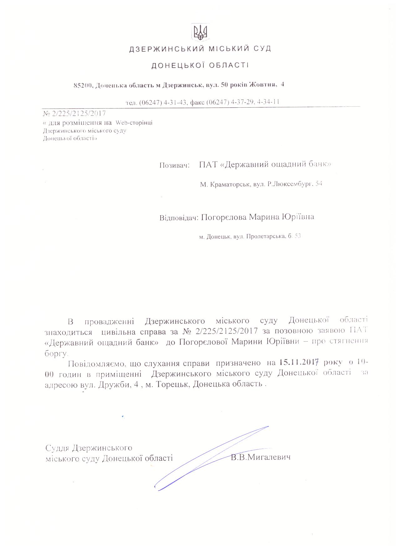 Виклик сторін до суду по справі за позовом ПАТ "Державний ощадний банк" до Погорєлової М.Ю.