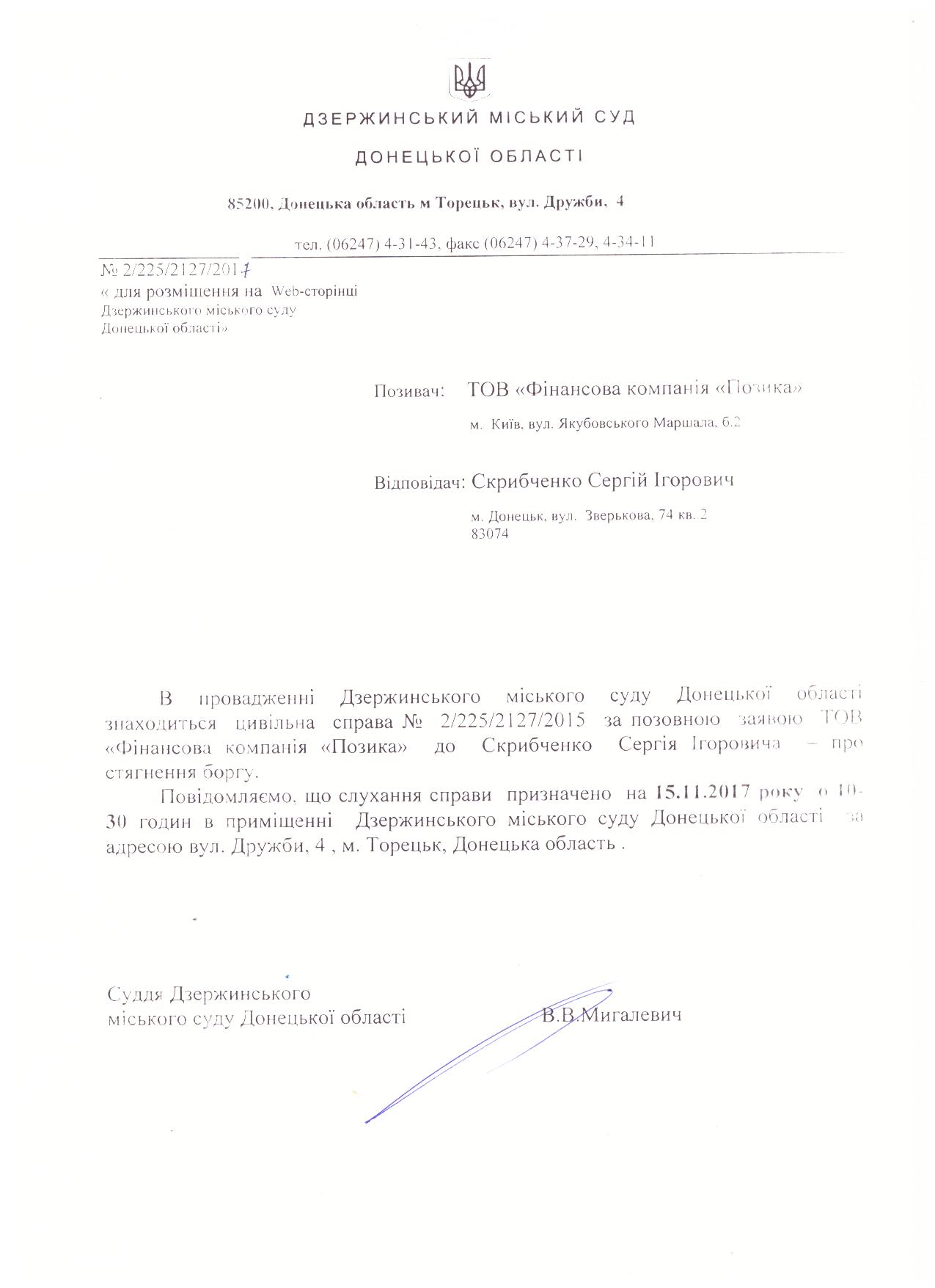 Виклик сторін до суду по справі за позовом ТОВ "ФК "Позика" до Скрибченко С.І,