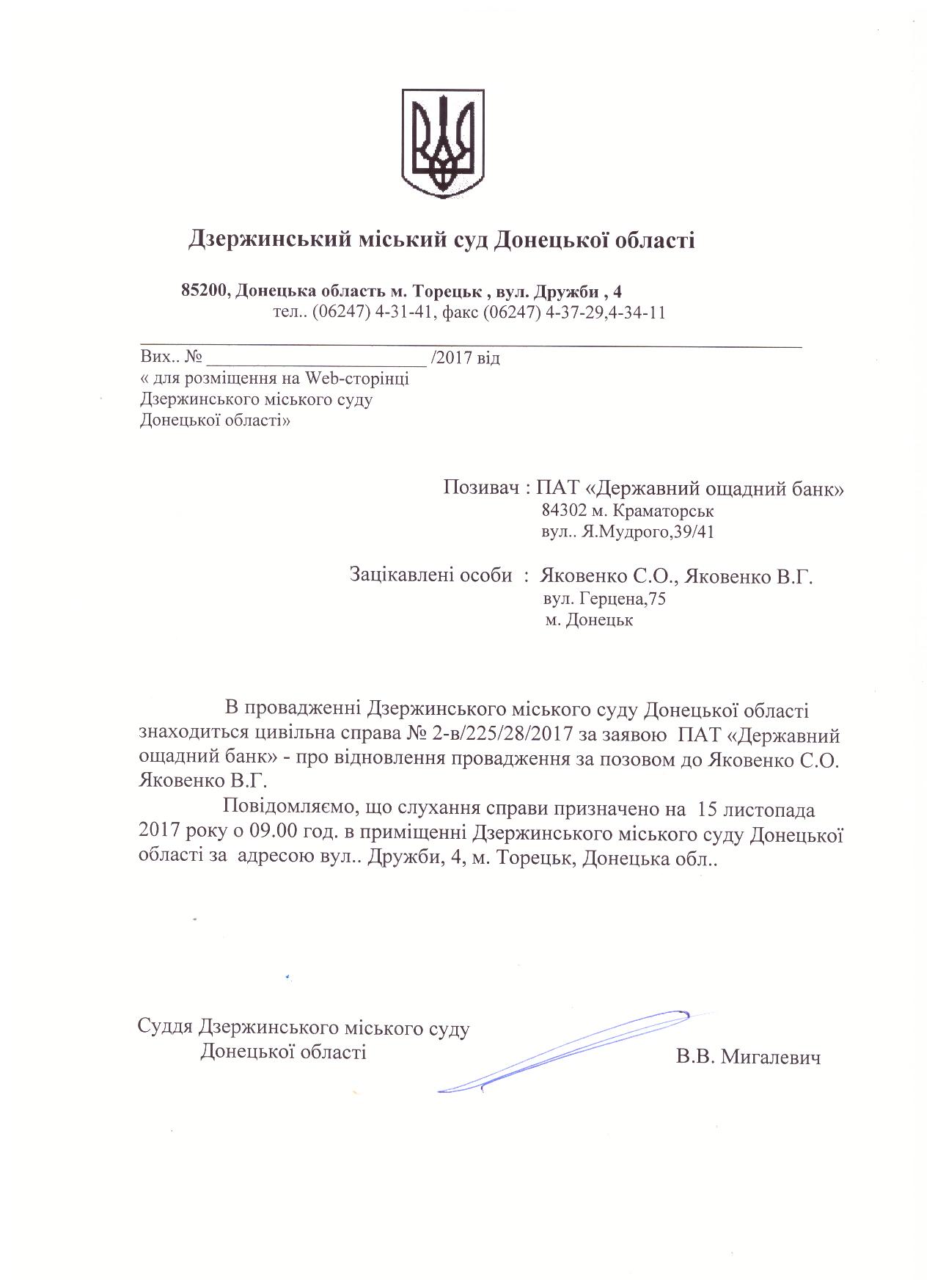 Виклик сторін до суду по справі за заявою ПАТ "Державний ощадний банк"