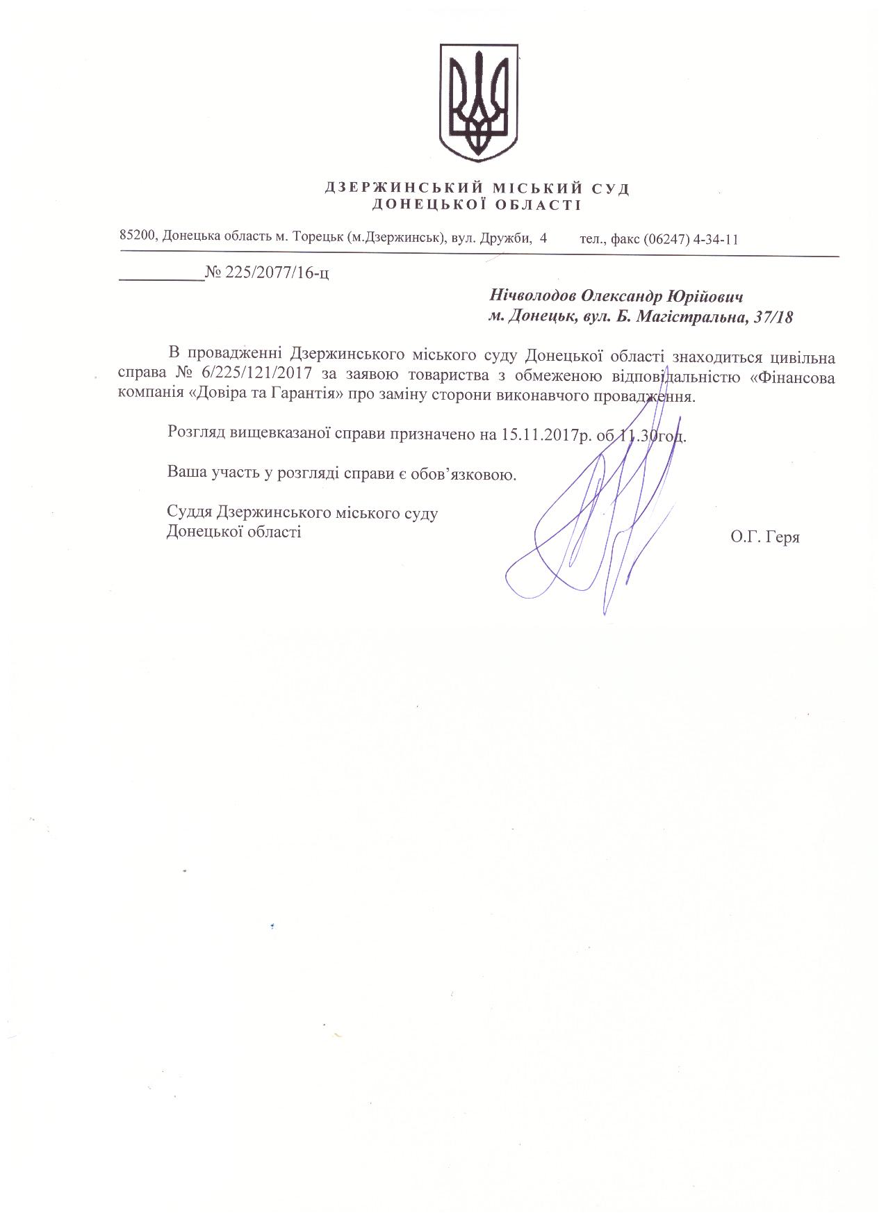 Виклик до суду по справі за заявою ТОВ ФК "Довіра та Гарантія" про заміну сторони виконавчого провадження