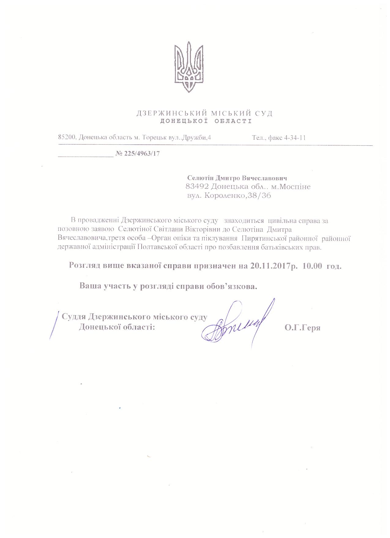 Виклик сторін до суду по справі за позовом Селютіної С.В. до Селютіна Д.В., третя особа - орган опіки та піклування Пирятинської районної державної адміністрації Полтавської області