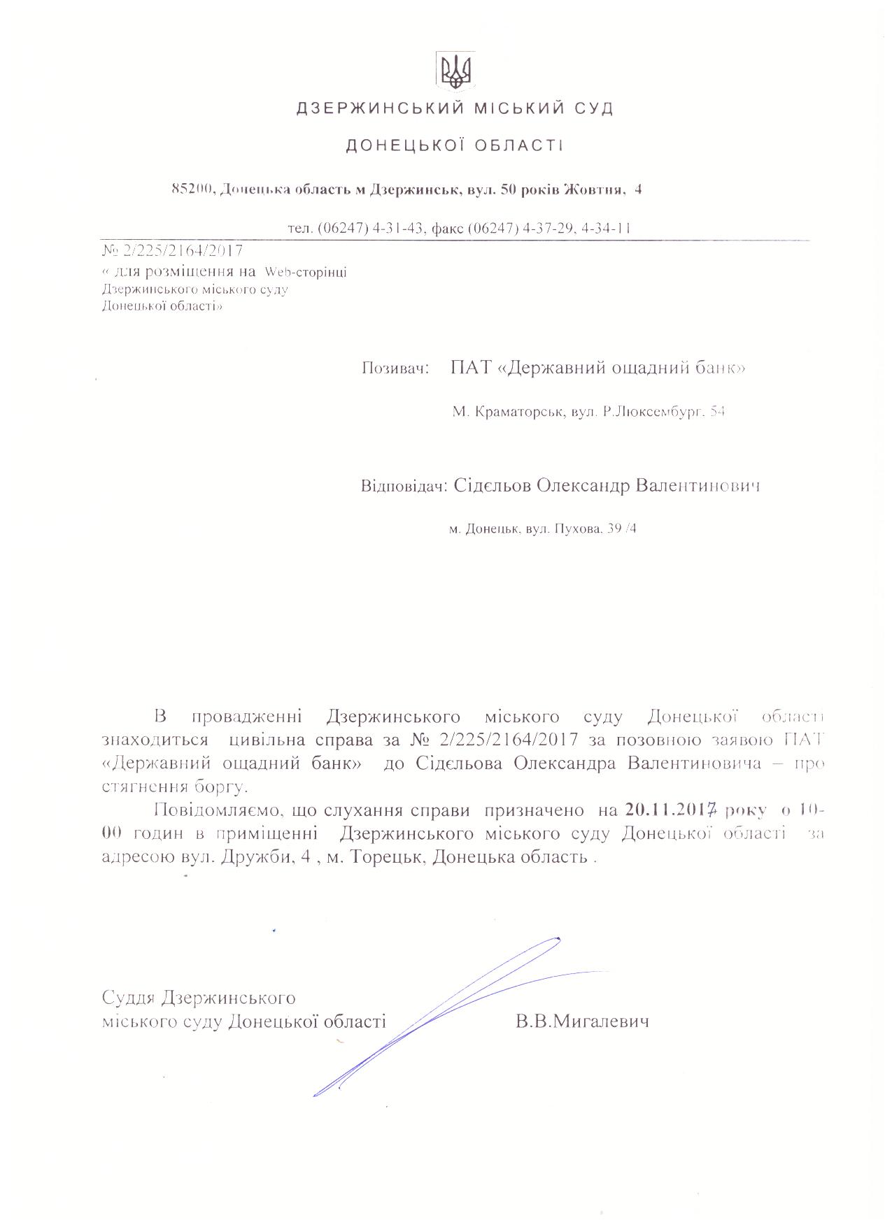 Виклик сторін до суду по справі за позовом ПАТ "Державний ощадний банк" до Сидельова О.В.