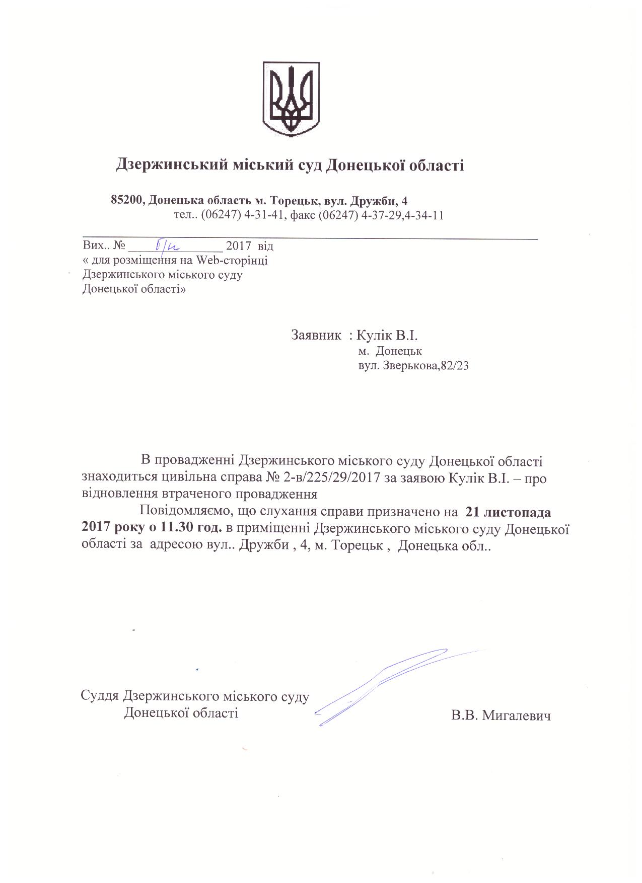 Виклик сторін до суду по справі за заявою Кулік В.І.