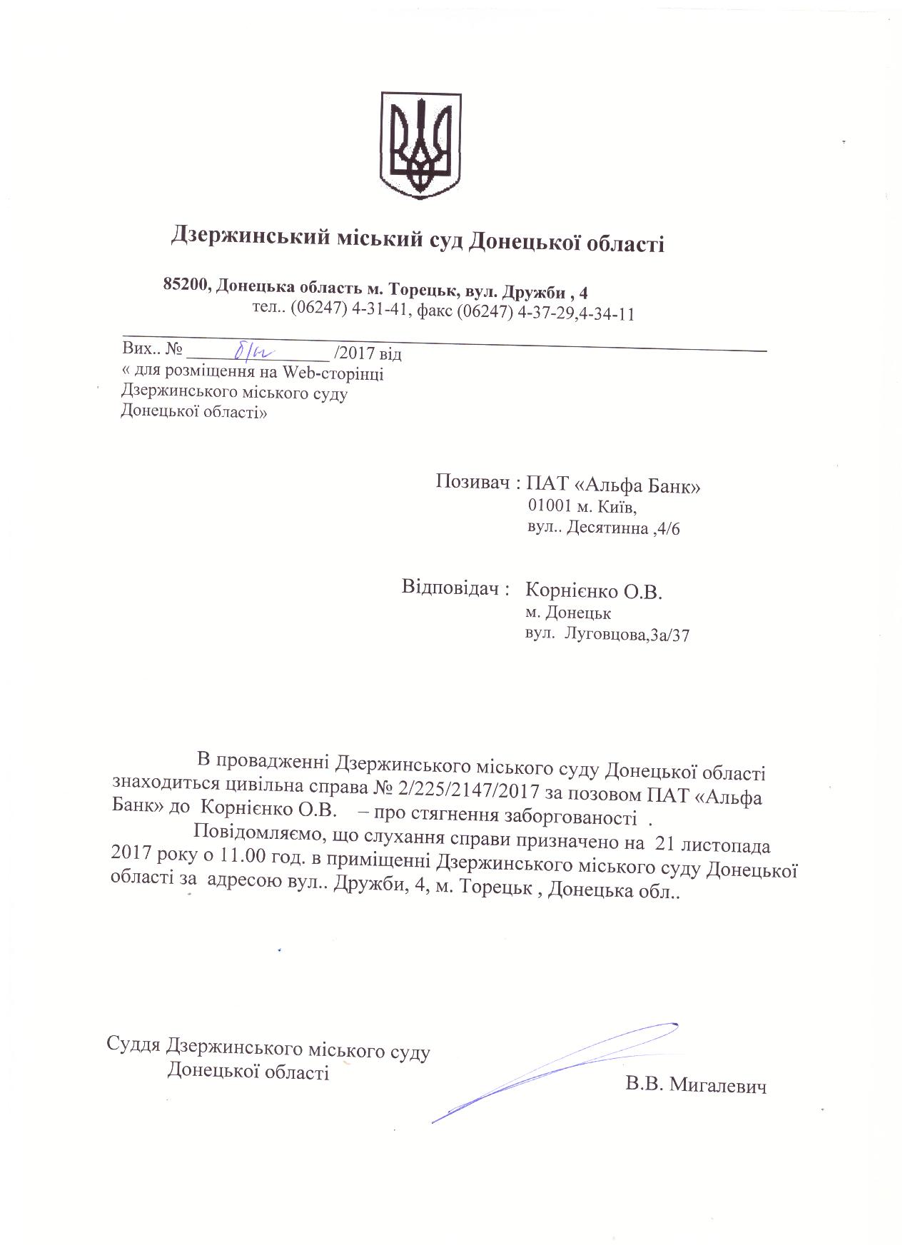 Виклик сторін до суду по справі за позовом ПАТ "Альфа Банк" до Корнієнко О.В.
