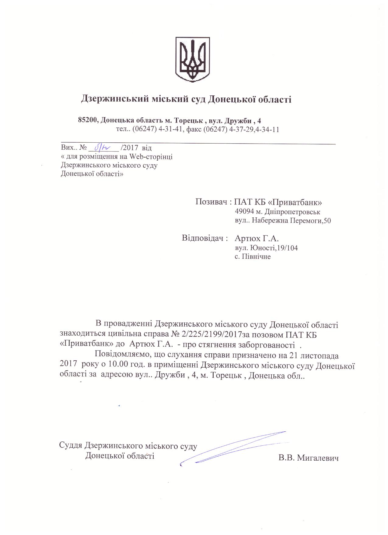 Виклик сторін до суду по справі за позовом ПАТ КБ "Приватбанк" до Артюх Г.А.
