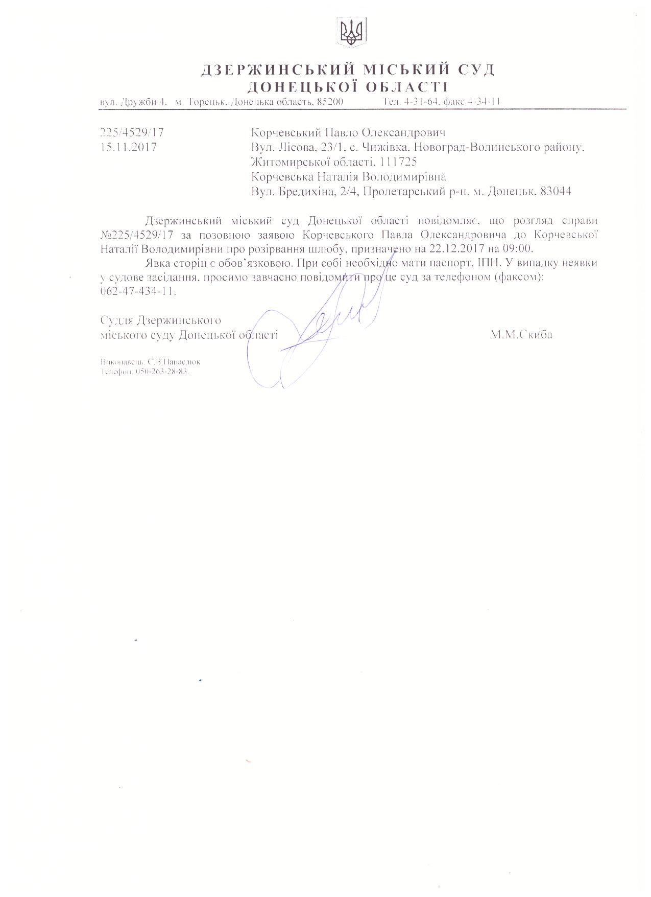 Виклик сторін до суду по справі за позовом Корчевського П.О. до Корчевської Н.В.