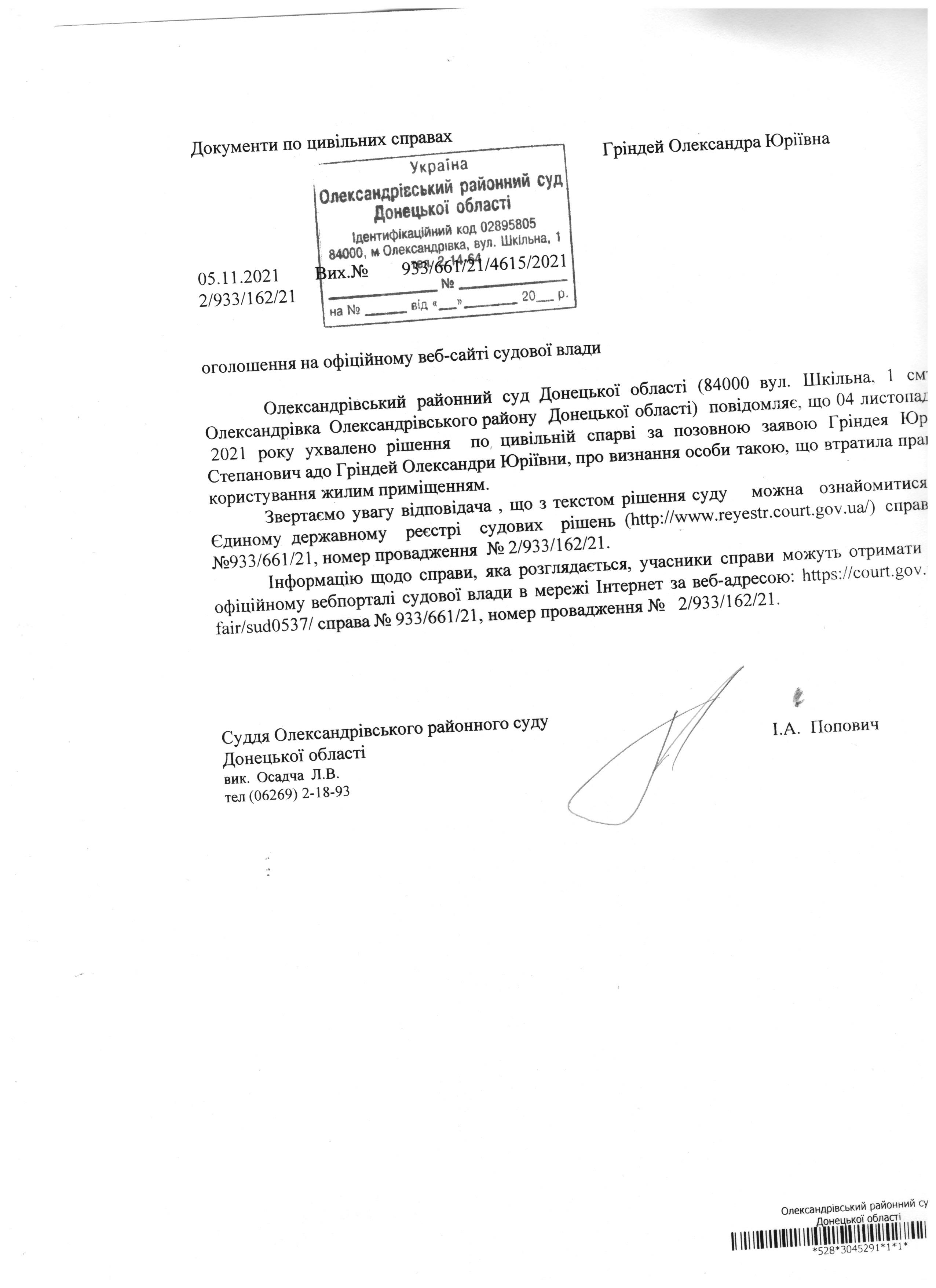 Оголошення Гріндей О.Ю.