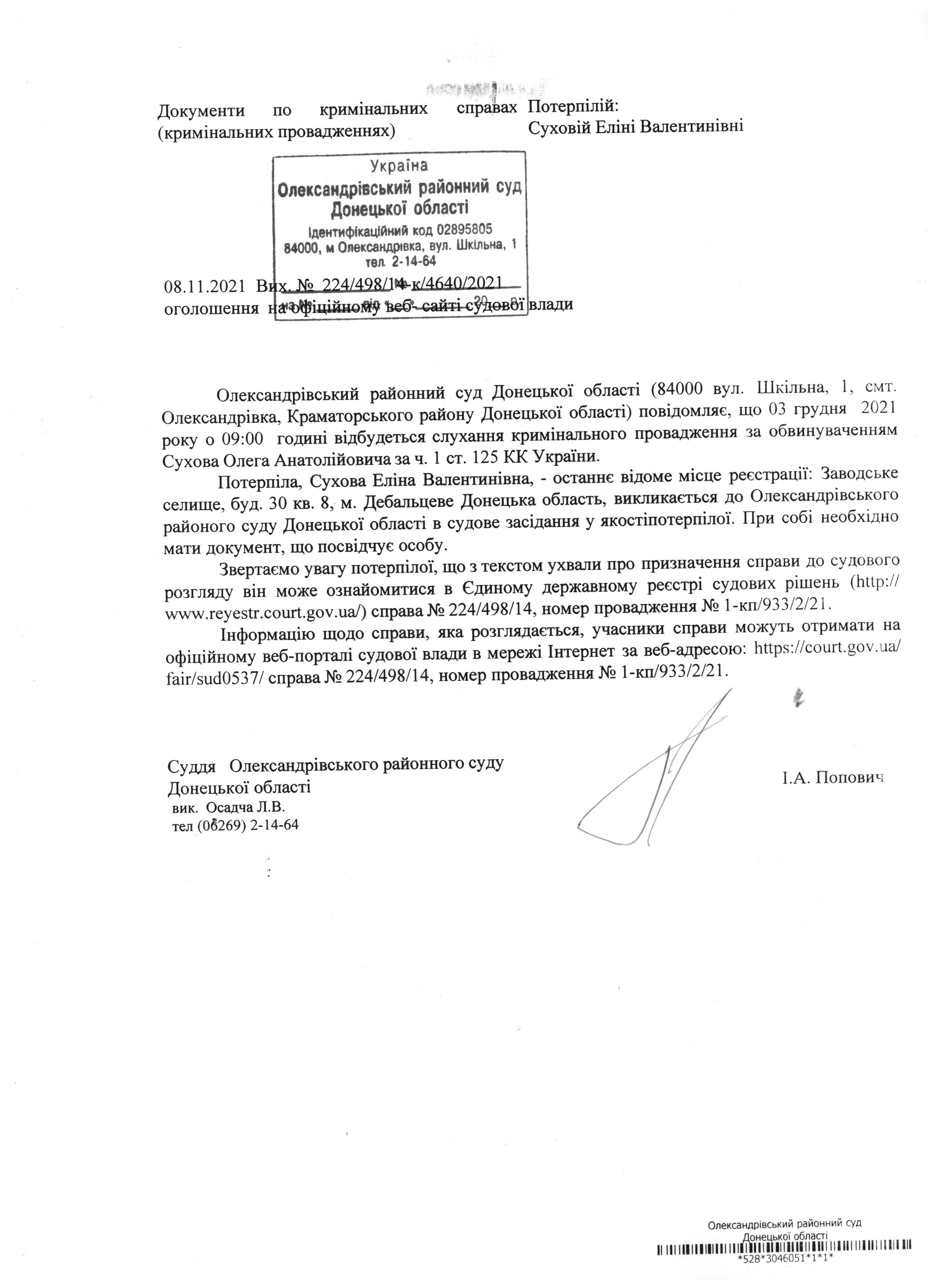Оголошення Суховій Е.В.