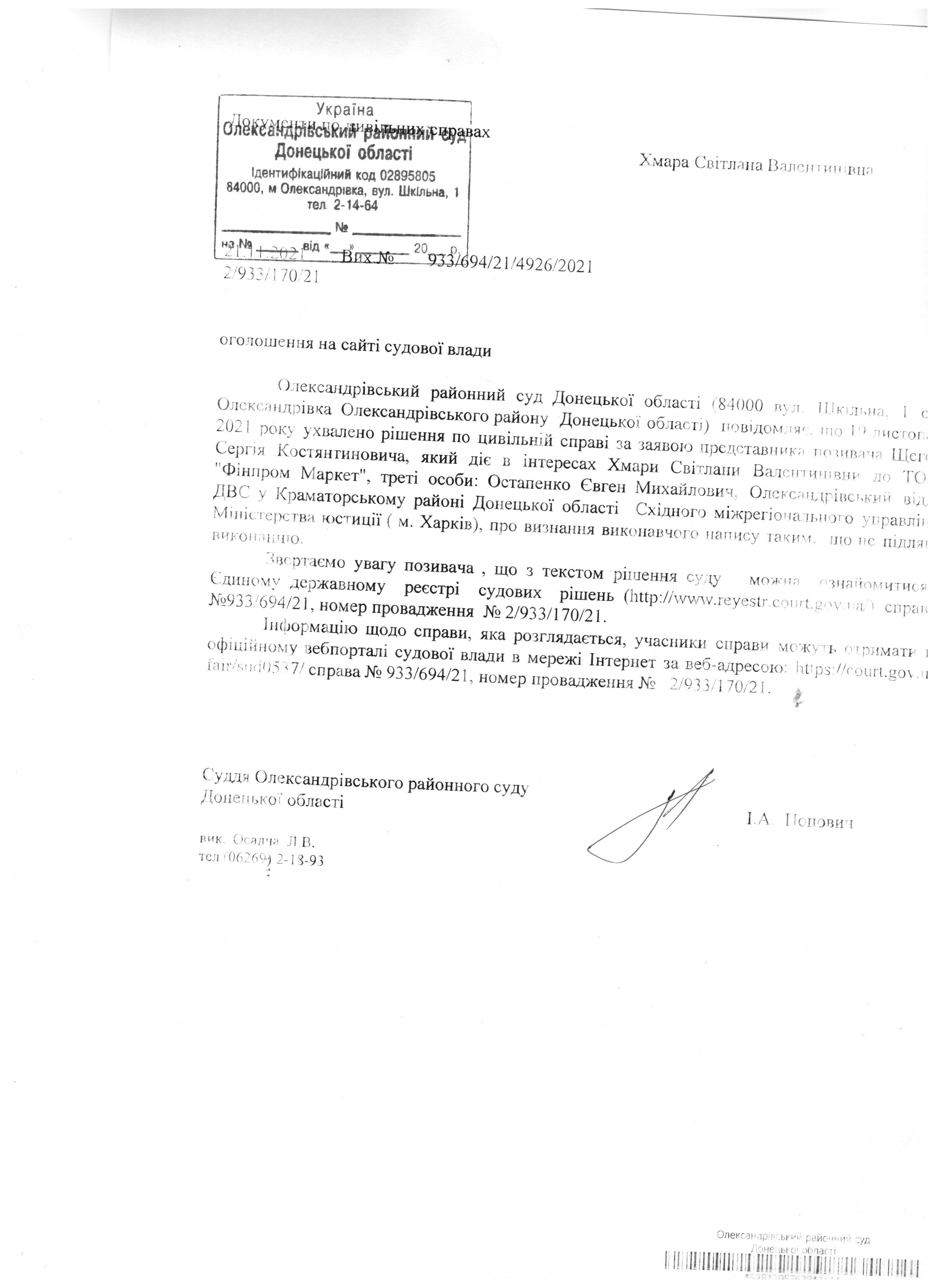 Оголошення Хмарі С.В.