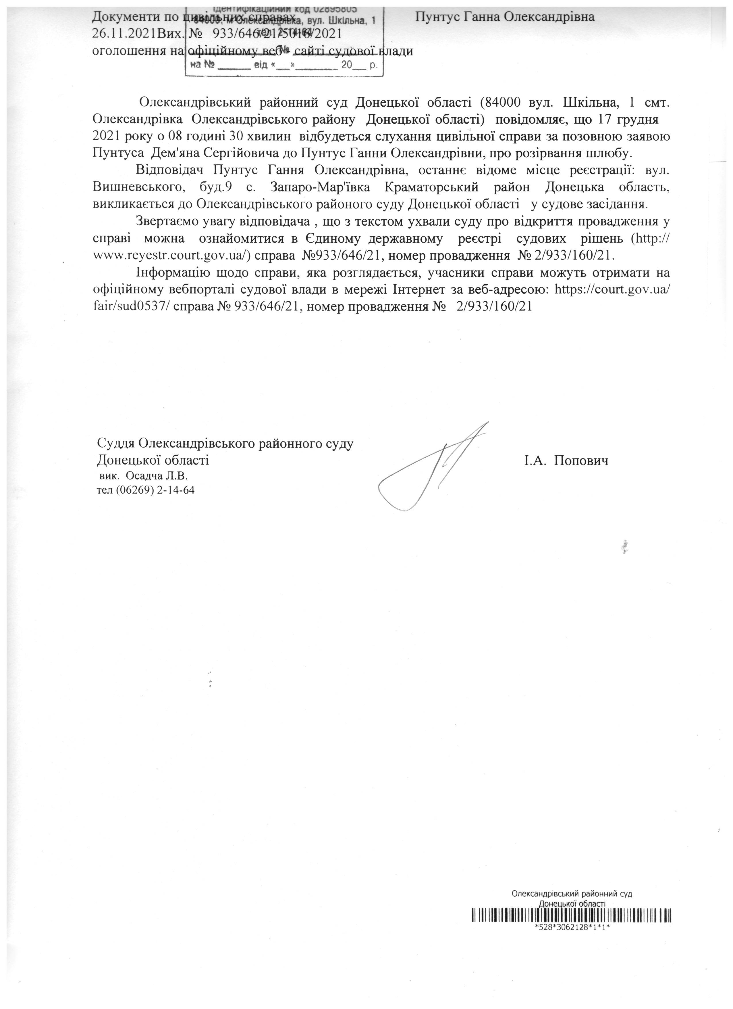 Оголошення Пунтус Г.О.