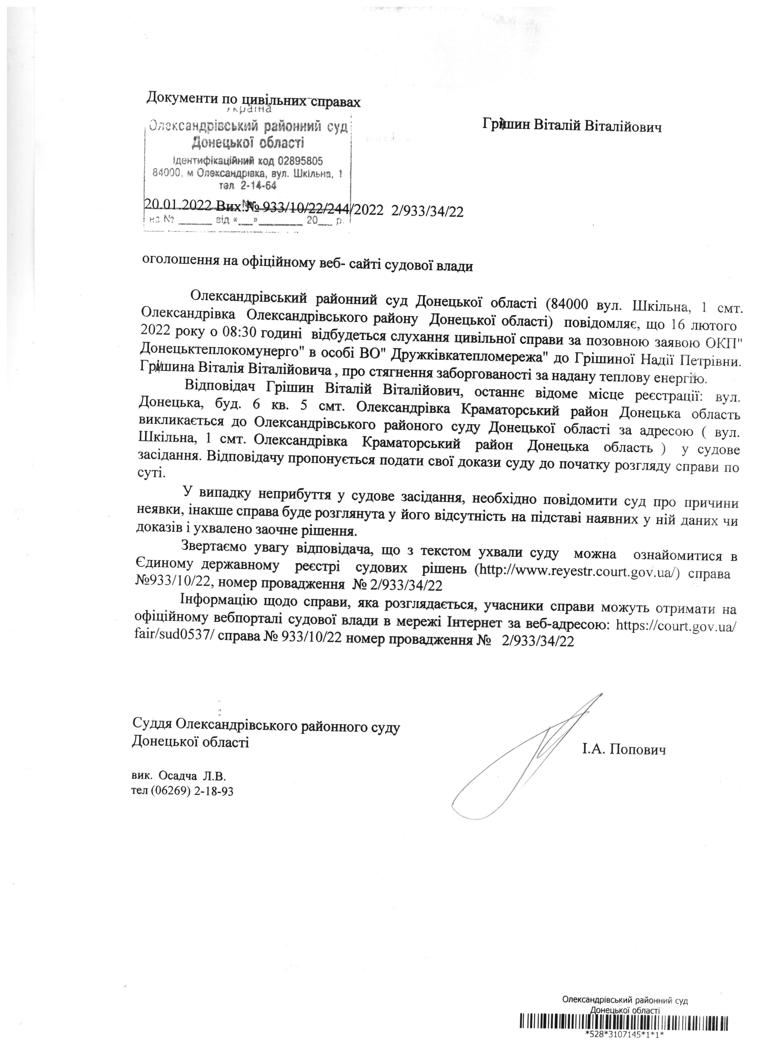 Оголошення для Гришина В.В.