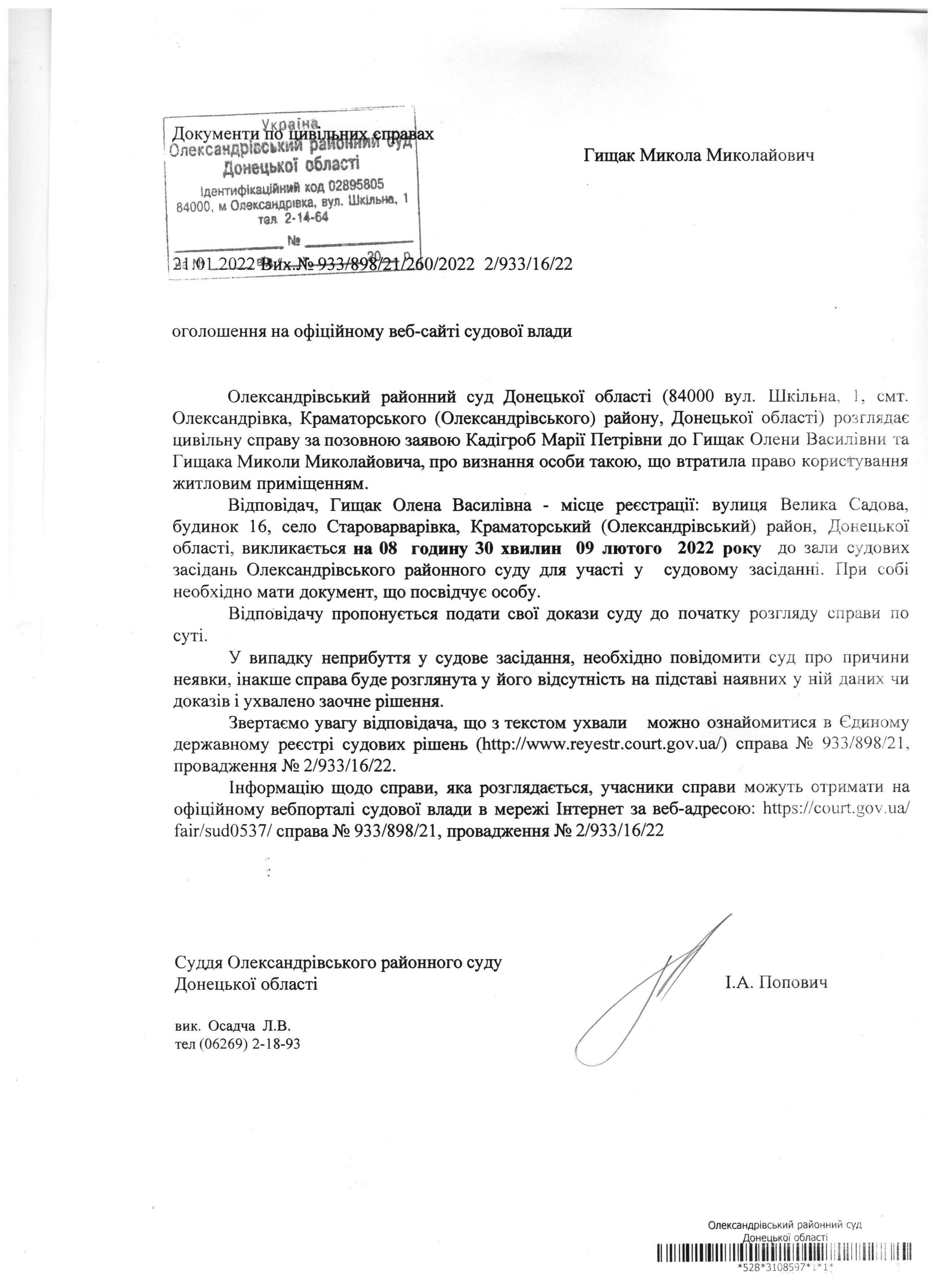 Оголошення Гищаку М.М.