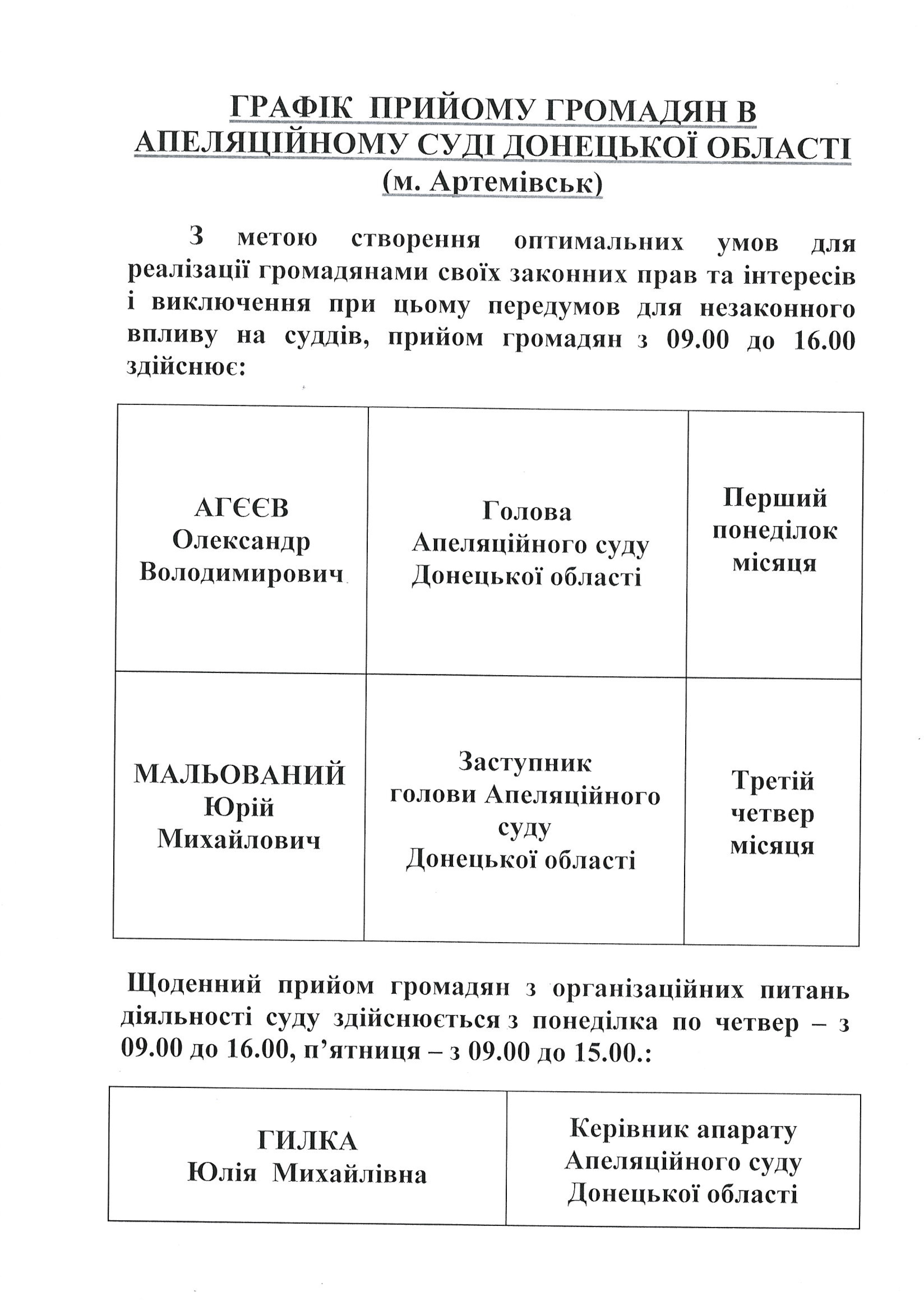 Графік прийому громадян в Апеляційному суді Донецької області (м.Артемівськ)